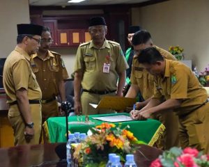 Penandatanganan berita acara pelantikan turut dilaksanakan sebagai bagian dari rangkaian kegiatan, yang disaksikan Asisten Administrasi Umum, Sirajuddin, S. Sos , Kaharudin, S.S (Kepala Badan Kepegawaian Dan Pengembangan Sumber Daya Manusia),