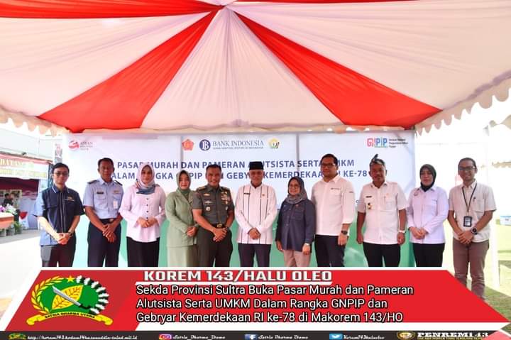 Sekertaris Daerah (Sekda) Provinsi Sulawesi Tenggara (Sultra) Drs.Asrun Lio M.Hum.,P.h. membuka pasar murah dan pameran alutista serta UMKM dalam rangka Gerakan Nasional Penanganan Inflasi Pangan (GNPIP) dan gebyar kemerdekaan Republik Indonesia ke -78 bertempat Makorem 143/HO.