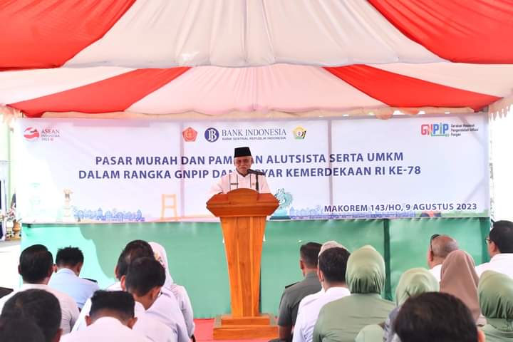 Disampaikan Rusmin pasar murah dan pameran alutista serta UMKM dalam rangka Gerakan Nasional Penanganan Inflasi Pangan (GNPIP) dan gebyar kemerdekaan Republik Indonesia ke -78 di Makorem 143/HO dibuka mulai tanggal 9 sampai dengan 11 Agustus 2023.