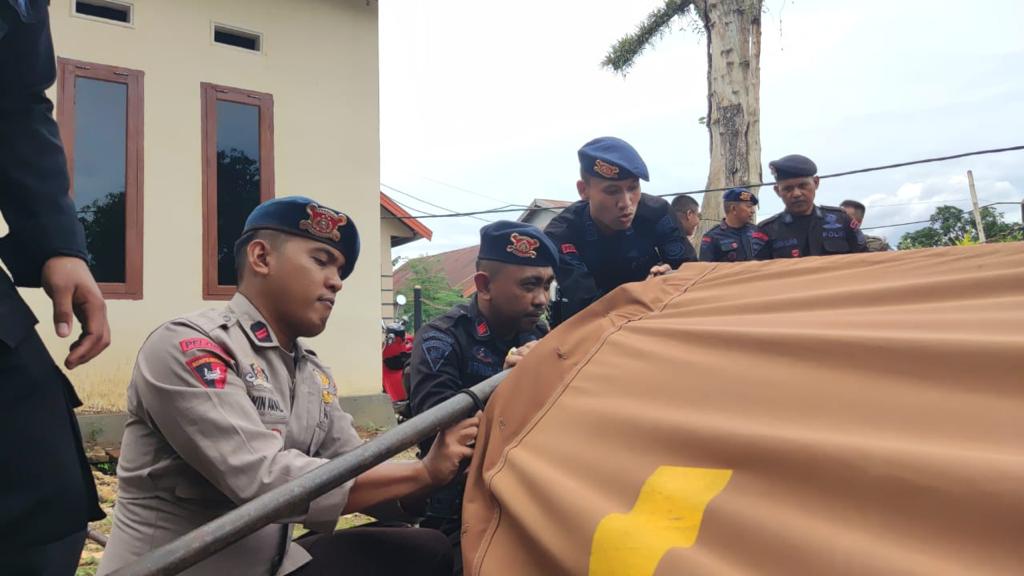 Selain memberikan bantuan tenda darurat, personel Brimob Bone juga membantu mengevakuasi jenazah korban kebakaran yang tiba dari rumah sakit ke rumah duka untuk diserahkan ke pihak keluarga.