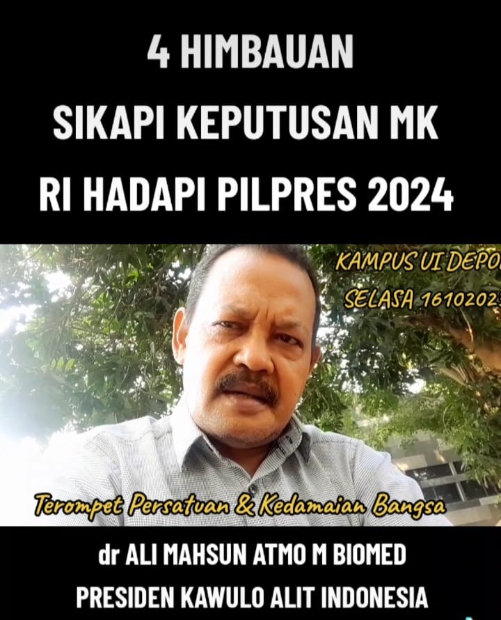 Ijinkan kami, dr Ali Mahsun ATMO M Biomed., selaku Presiden Kawulo Alit Indonesia (KAI) untuk menyikapi Keputusan Mahkamah Konstitusi (MK) RI Senin 16 Oktober 2023 tentang syarat Capres dan Cawapres Pilpres RI 2024. Yang memperkenankan walau umur belum 40 tahun namun pernah atau sedang menjadi Kepala Daerah diperkenankan mencalonkan diri sebagai Capres dan Cawapres Pilpres RI 2024.