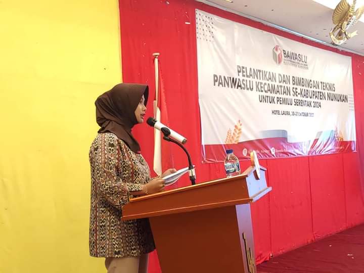 NUNUKAN – Bupati Kabupaten Nunukan Hj.Asmin Laura Hafid menghadiri acara pelantikan dan bimbingan teknis pengawas pemilihan umum kecamatan, Se- Kabupaten Nunukan oleh Bawaslu Kabupaten Nunukan Tahun 2022 bertempat ruang pertemuan lt. 3 Hotel Laura, Minggu (30/10/22).