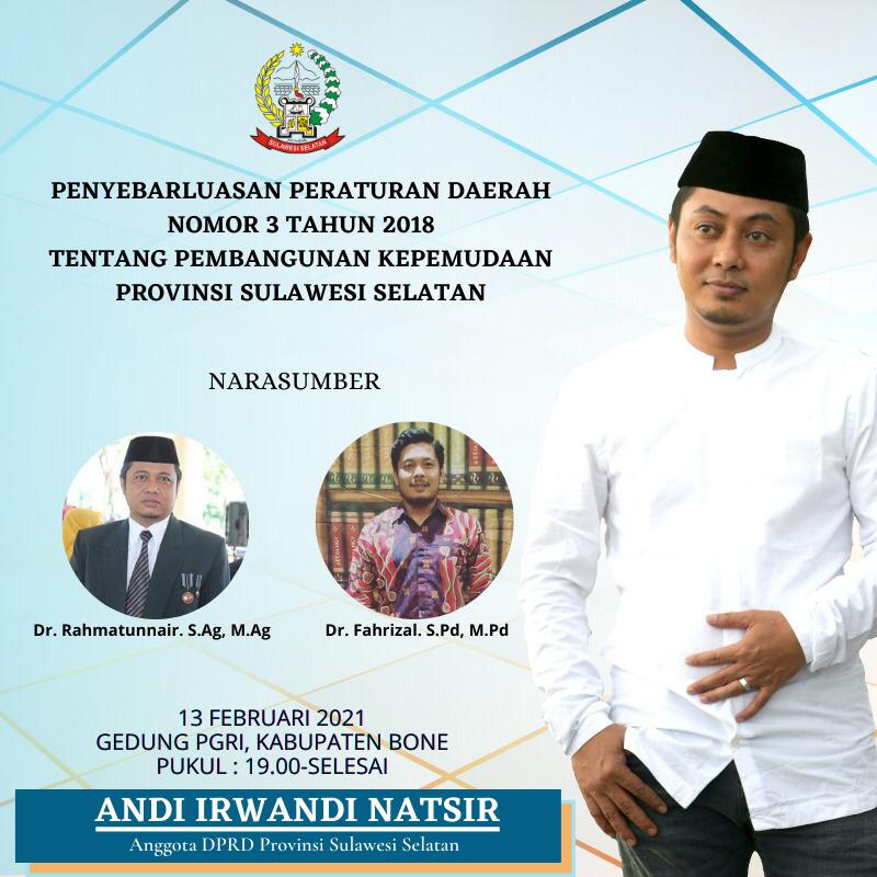 Andi Irwandi Natsir .S.Sos M.Si Anggota DPRD provinsi Sulawesi Selatan, Hadir bicara dalam penyebar luasan produk hukum untuk kepemudaan Ini ,
