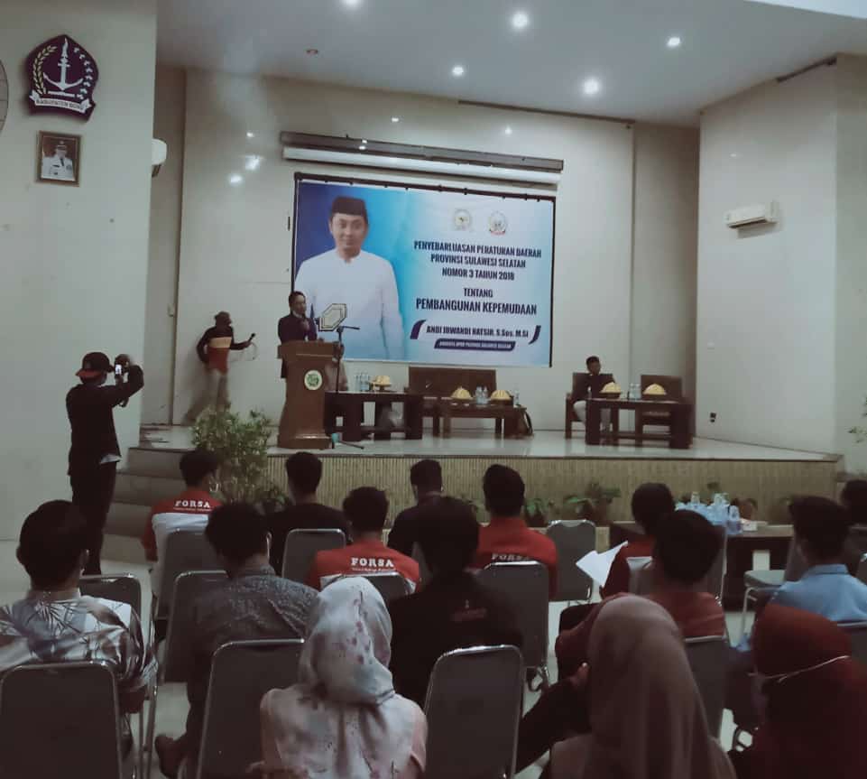 Penyebarluasan peraturan daerah provinsi Sulawesi Selatan nomor 3 tahun 2018 tentang pembangunan kepemudaan yang berlangsung di Gedung PGRI jln jenderal Ahmad Yani Kelurahan Macanang Tanete Riattang barat kab Bone Sulawesi Selatan,