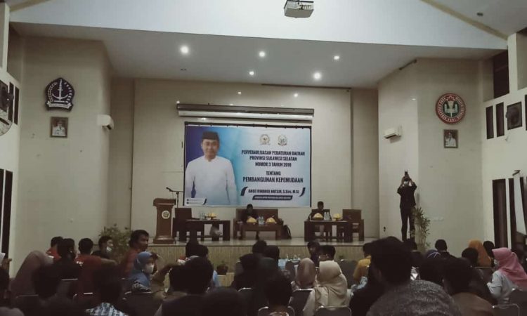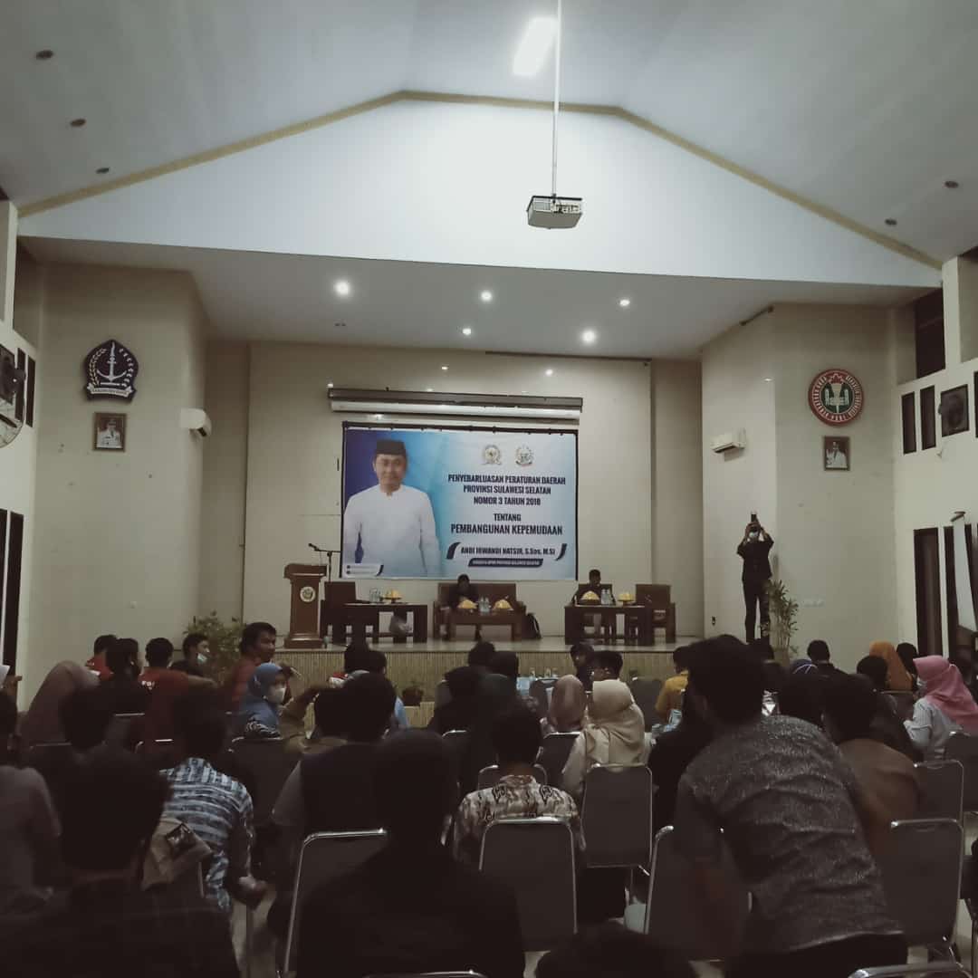 Penyebarluasan peraturan daerah provinsi Sulawesi Selatan nomor 3 tahun 2018 tentang pembangunan kepemudaan yang berlangsung di Gedung PGRI jln jenderal Ahmad Yani Kelurahan Macanang Tanete Riattang barat kab Bone Sulawesi Selatan,