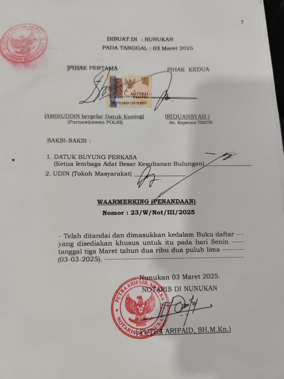 Menurut Datuk Kuning, Surat Penyerahan Hak tertanggal 09 Februari 1957 turut diketahui / disaksikan oleh Asisten Wedana Tanjung Palas Tuan A. Saleh Gelar Datuk Amir Hasanuddin dan disahkan oleh Nely Elvina Marpaung atas nama Kepala kantor Menteri Keuangan, begitu juga Surat Keterangan Hak Milik tertanggal 05 Januari 1961 yang ditandatangani Bupati Bulungan saat itu ada dalam genggamannya.