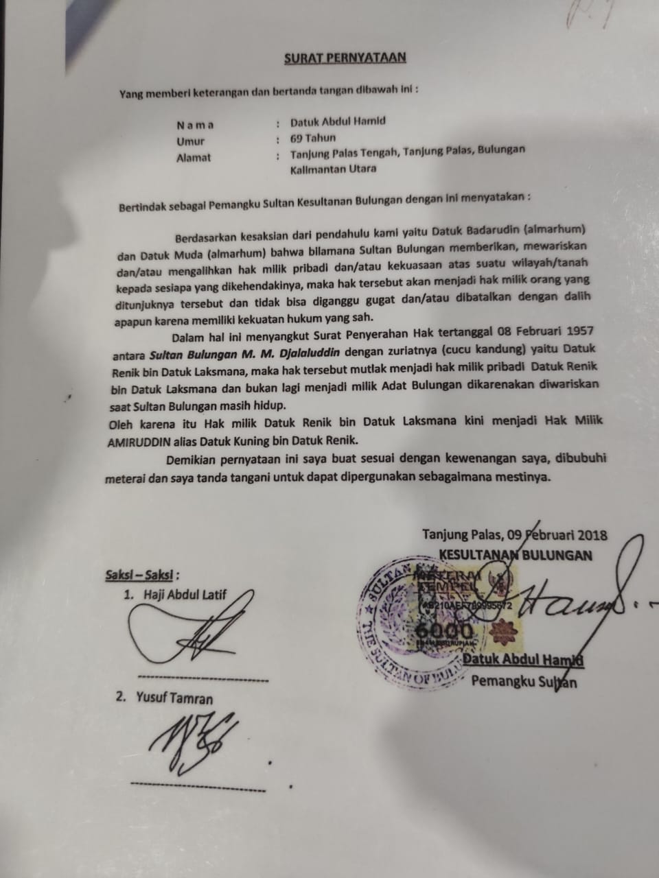 Menurutnya surat pernyataan Datuk Abdul Hamid Pemangku Kesultanan Bulungan sangat bertentangan dengan pernytataan yang ditandatangani sendiri Datuk Abdul Hamid selaku Pemangku Kesultanan Bulungan di Tanjung Palas Kabupaten Bulungan pada tanggal 09 Februari 2018 disaksikan Haji Abdul Latif dan Yusuf Tamran yang mana dalam Surat Pernyataan itu Berisi Berdasarkan kesaksian dari pendahulu kami yaitu Datuk Badarudin (Almarhum) dan Datuk Muda (Almarhum) bahwa bilamana Sultan Bulungan memberikan, mewariskan, dan / atau mengalihkan hak milik pribadi dan / atau kekuasaan atas suatu wilayah / tanah kepada siapa yang dikehendakinya, maka hal tersebut akan menjadi hak milik orang yang ditunjuknya tersebut dan tidak bisa diganggu gugat dan / atau dibatalkan dengan dalih apapun karena memiliki kekuatan hukum yang sah.