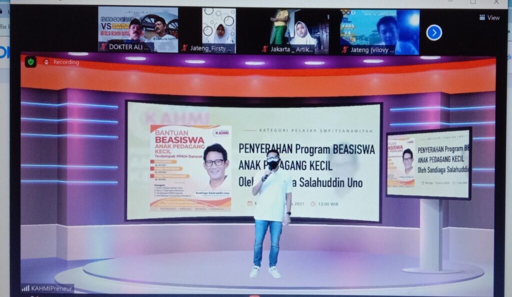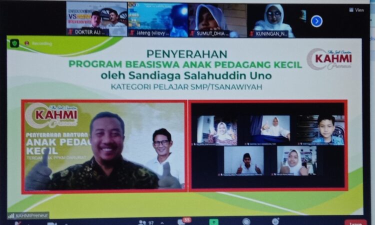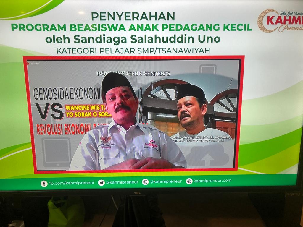 Beasiswa kepada 1000 anak pedagang kecil PKL, SMP/Tsanawiyah, SMA/MA dan Mahasiswa. InsyaAllah do’a mereka, doa rakyat kecil kawulo alit diijabah Gusti Alloh untuk kesuksesan yang jauh lebih besar dan luas, khususnya ke Mas Sandiaga S Uno dan Bung Kamrussamad, Founder KAHMI preneur, amin, pungkas Ali Mahsun ATMO, lelaki sahaja dokter ahli kekebalan tubuh (imunologi)