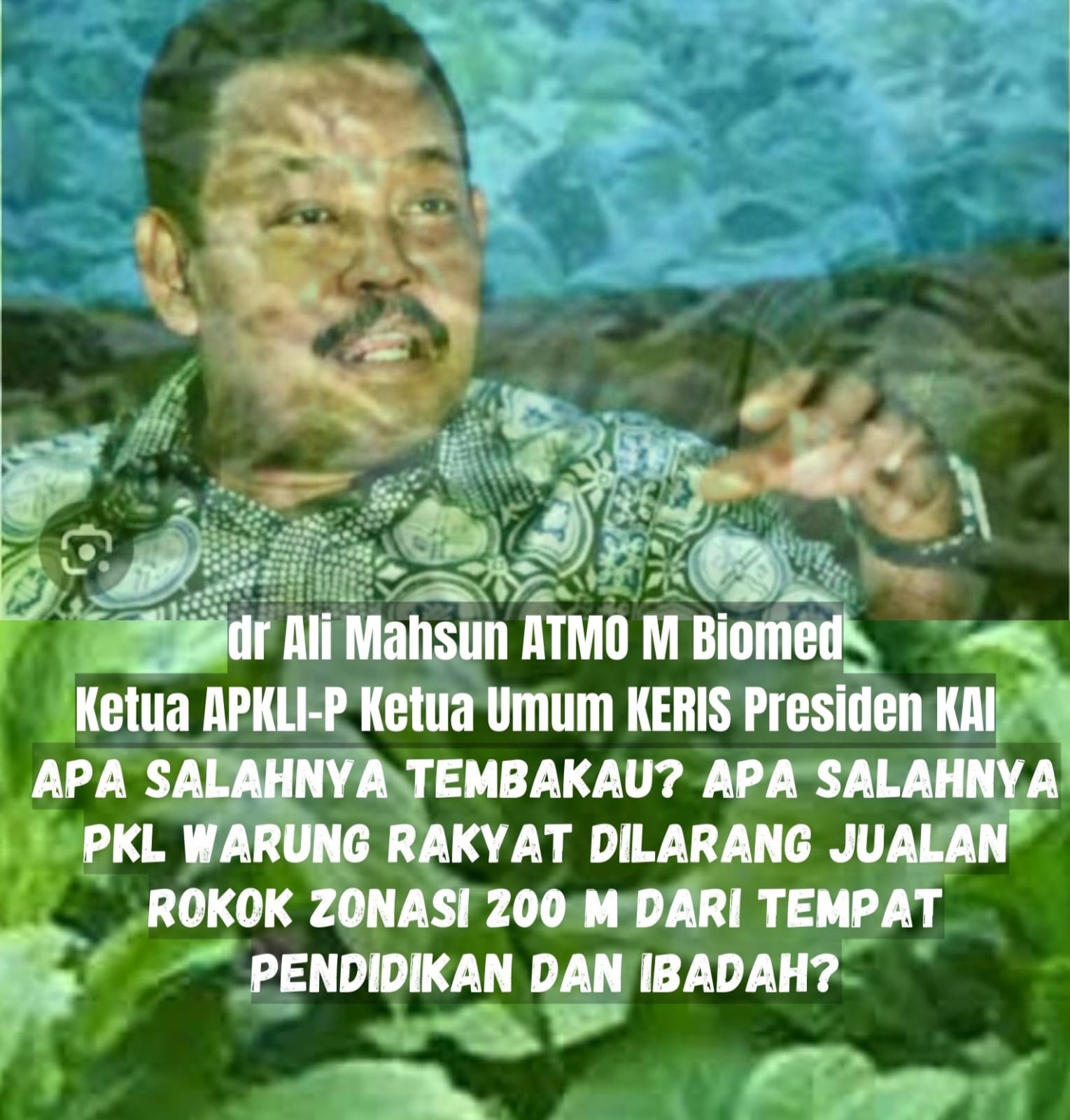 *Pengaturan tembakau dalam RPP Kesehatan UU 17/2023 meresahkan bahkan bisa matikan ekonomi rakyat UMKM. Bisa akibatkan ledakan pengangguran nambah beban lebih berat adanya 9,9 juta Gen Z Nganggur saat ini. Oleh karena itu harus dikaji ulang (dr Ali Mahsun ATMO M Biomed. Ketua Umum APKLI-P, Ketua Umum KERIS dan Presiden KAI)*