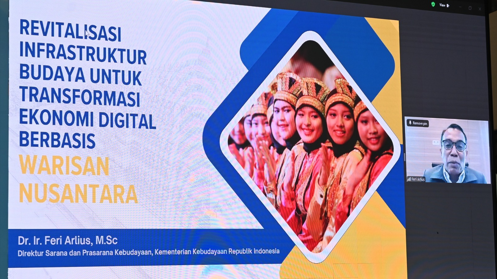 Sorotan utama lainnya datang dari Dr. Ir. Feri Arlius, M.Sc., Direktur Sarana dan Prasarana Kebudayaan, Kementerian Kebudayaan RI. Meskipun hadir secara daring karena menjalankan tugas negara, Ia memaparkan gagasan visioner mengenai sinergi antara pembangunan infrastruktur kebudayaan dan transformasi digital.