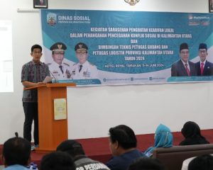TARAKAN – Dinas Sosial Provinsi Kalimantan Utara (Kaltara) melaksanakan kegiatan sarasehan penguatan kearifan lokal dalam penanganan pencegahan konflik sosial di Kaltara dan bimbingan teknis (Bimtek) petugas gudang dan petugas logistik Provinsi Kaltara tahun 2024 di Hotel Royal Tarakan, Rabu (12/6/2024).
