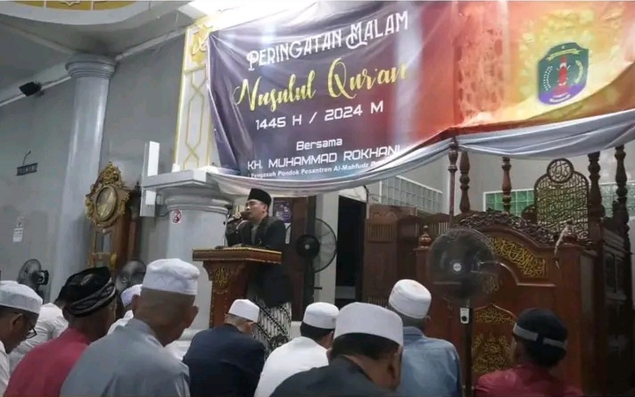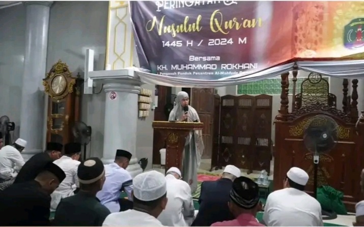 NUNUKAN- Pemkab Nunukan menggelar pengajian peringatan Nuzulul Qur’an bulan Ramadhan 1445 H/ 2024 di Masjid Agung Al Mujahidin Nunukan, Rabu (27/3/2024). Pengajian tersebut dihadiri Bupati Nunukan, Hj.Asmin Laura Hafid dan Wakil Bupati H. Hanafiah. Tausyiah Pengajian Nuzulul Qur’an tersebut diberikan oleh KH. Muhammad Rokhani pengasuh Pondok pesantren Al Mahfud Demak Jawa Tengah.