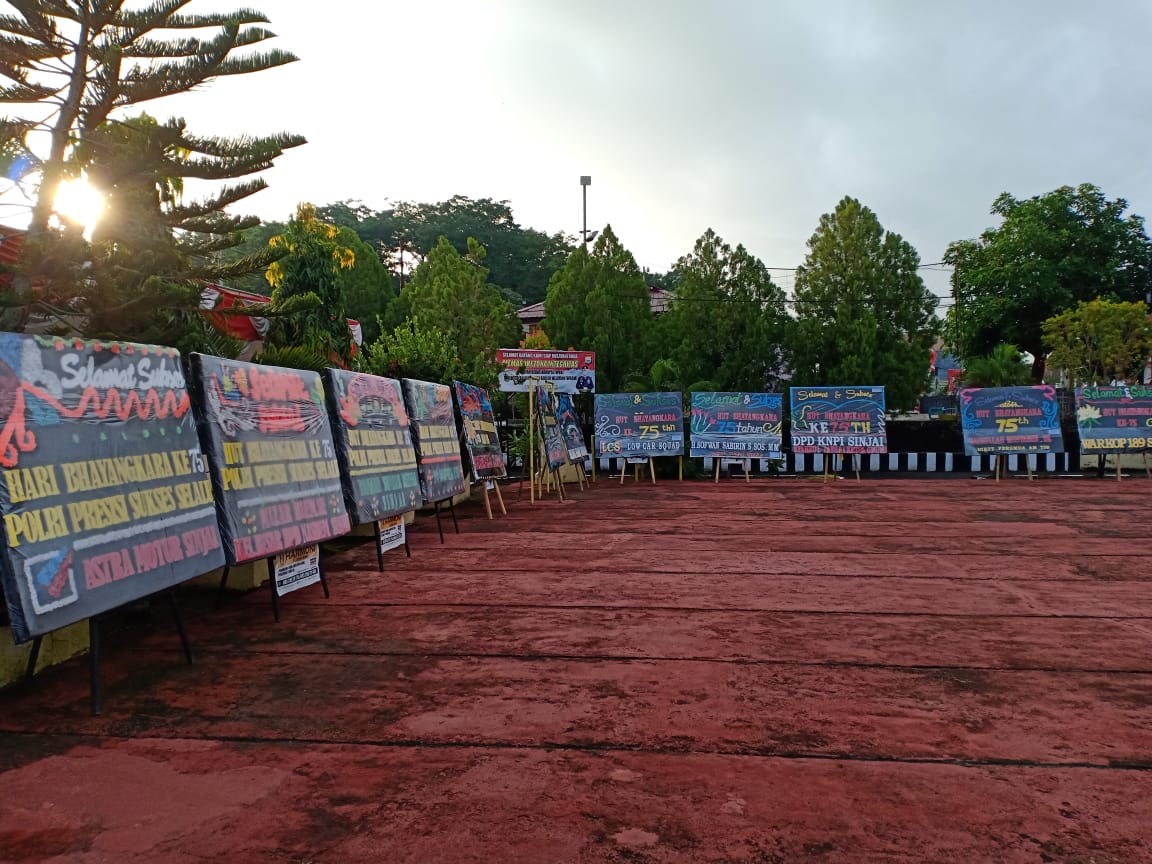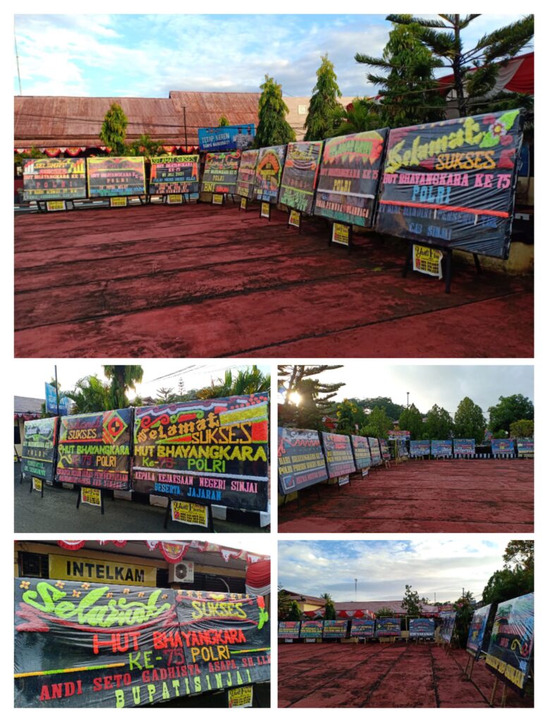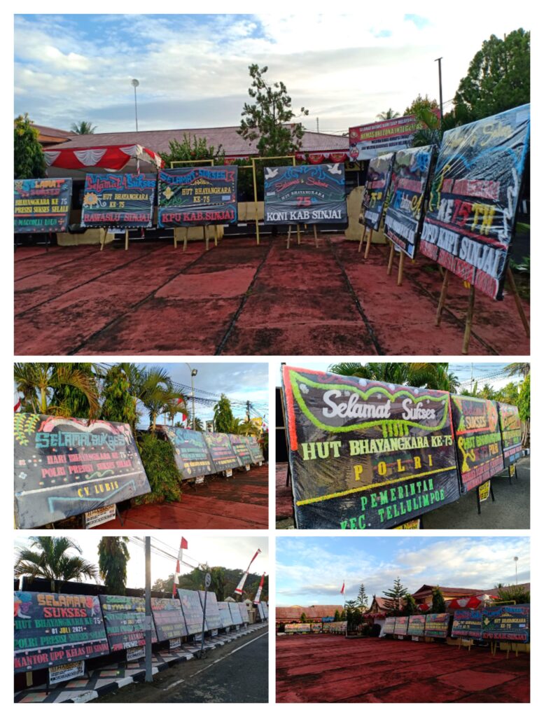 Sejumlah karangan bunga yang dikirim ke Polres Sinjai merupakan ucapan selamat Hari Ulang Tahun (HUT) Bhayangkara Ke-75 Tahun dari berbagai kalangan. Dan karangan bunga diletakkan didepan Mapolres Sinjai yang diliat dan dibaca langsung saat melintas.