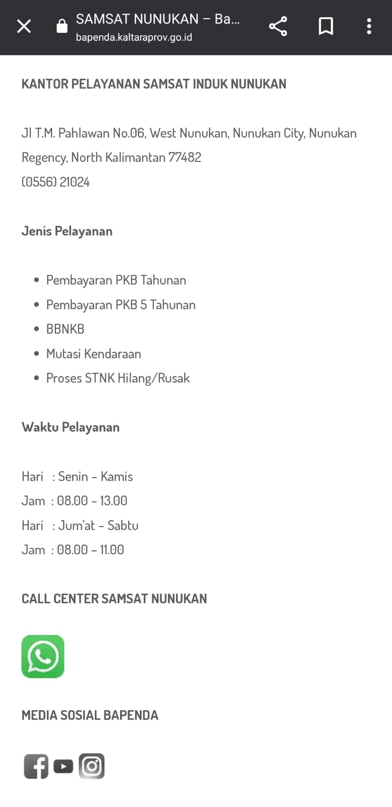 Hal tersebut terlihat dari jam pelayanan Samsat Nunukan yang tertera di laman website resmi Bapenda Kaltara berbeda dengan waktu pelayanan di kantor.