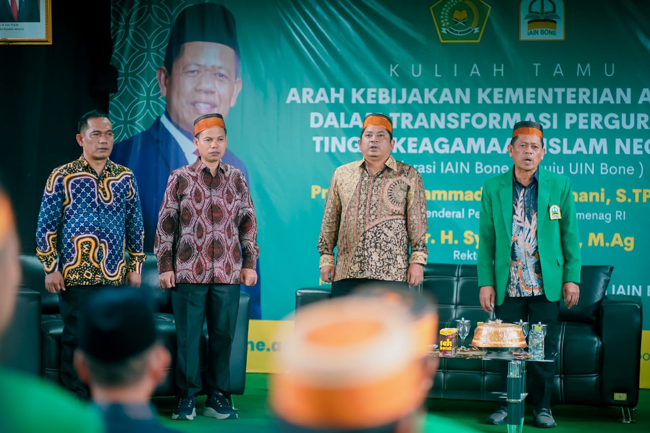 IAIN Bone terus lakukan upaya akselerasi alih bentuk IAIN menjadi UIN. Salah satunya dengan hadirkan langsung Direktur Jenderal Pendidikan Islam (Dirjen Pendis) Kemenag RI Prof. Muhammad Ali Ramdhani, S.PT., M.T dalam kuliah tamu yang bertajuk “Arah Kebijakan Kementerian Agama dalam Transformasi Perguruan Tinggi Keagamaan Islam Negeri”.