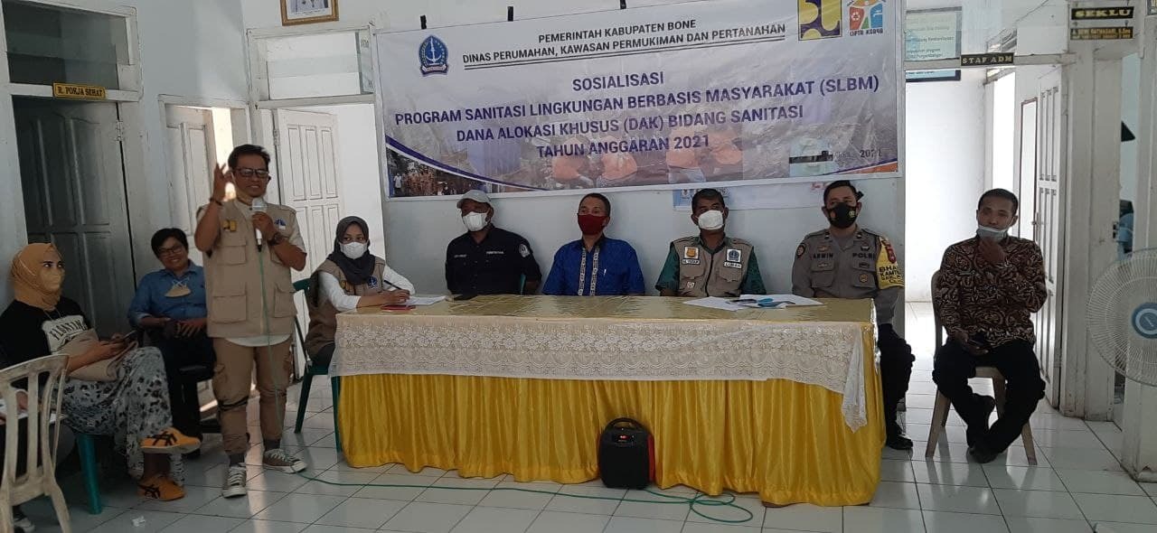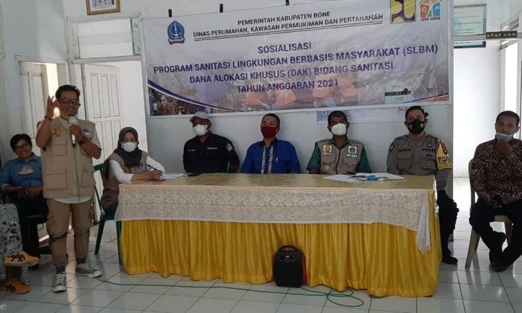 Sosialisasi program sanitasi lingkungan berbasis masyarakat (SLBM) Dana Alokasi Khusus (DAK) bidang sanitasi tahun anggaran 2021 diselenggarakan oleh Dinas perumahan, kawasan pemukiman dan pertanahan Kabupaten Bone.
