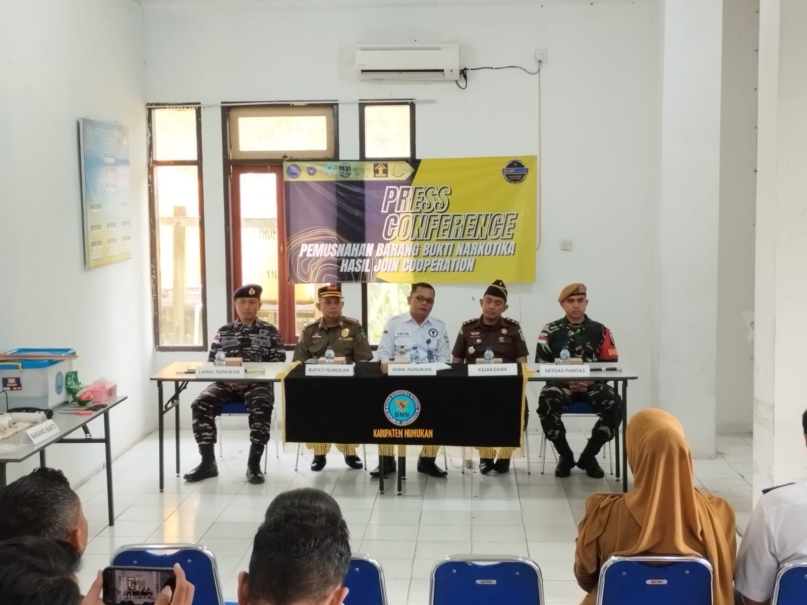 Adapun terlihat hadir dalam kegiatan konferensi pers, mewakili Bupati Nunukan, Kepala Satpol PP Kab.Nunukan, Mesak Adianto, Kepala BNNK Nunukan, Anton Suriyadi Siagian, Danlanal Nunukan, Letkol Laut (P) Handoyo, Dansatgas Pamtas RI-Mly Yon Arhanud 8/MBC, Letkol Arh Iwan Hermaya, Kejaksaan Negeri Nunukan, pers di lingkungan Kab.Nunukan serta jajaran BNNK Nunukan.