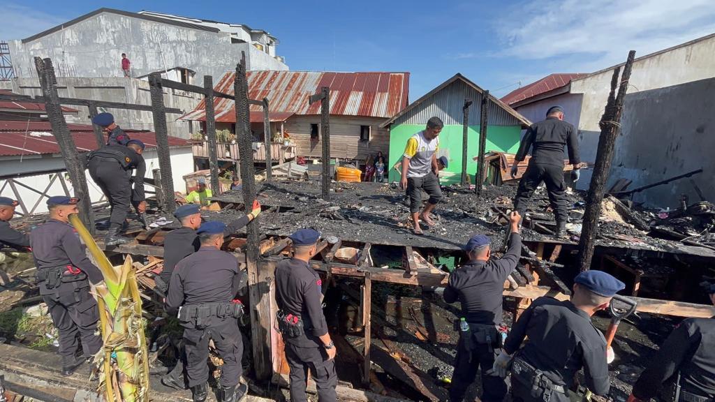 Brimob Bone Terjun Bantu Masyarakat Bersihkan Puing-puing Kebakaran di Bajoe