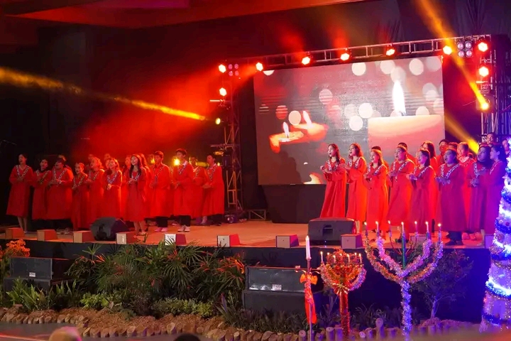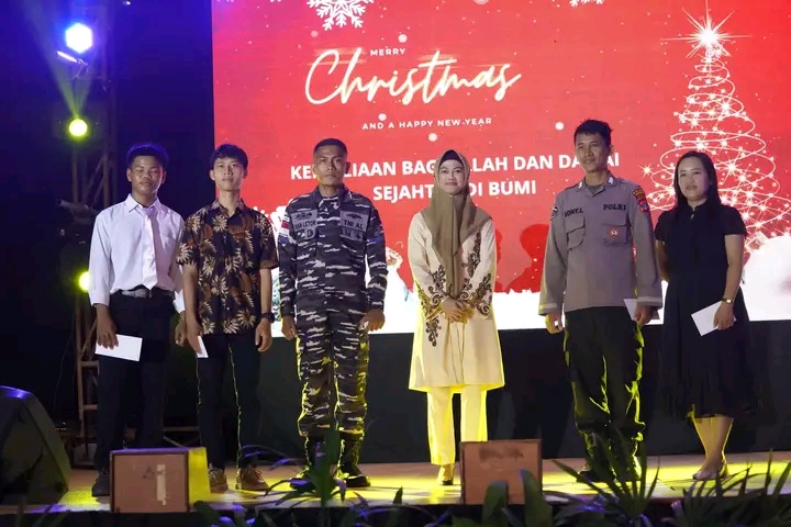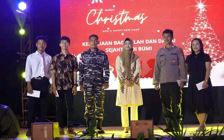 NUNUKAN- Bupati Nunukan Hj. Asmin Laura Hafid menghadiri ibadah dan perayaan natal gabungan tahun 2023 bersama Aparatur Sipil Negara, TNI – Polri, DPRD, umat kristen serta umat katolik di Kabupaten Nunukan. Acara tersebut dilaksanakan di GOR Dwikora Nunukan, Jumat (05/01).