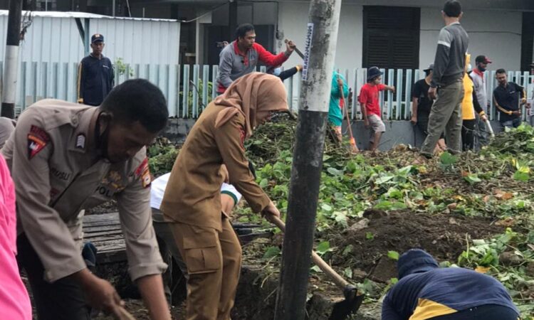 Tampak Andi Kumala Dewi Salahuddin S.Sstp bersama Babinsa koramil 1407-07/ Tanete Riattang ,bhabinkamtibmas Polsek urban bersihkan Sampah sampah yang memenuhi selokan ,ibu camat menggunakan Cangkul untuk mengangkat sampah Yang Sudah menyatu dengan tanah di selokan ,