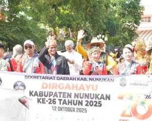 NUNUKAN – Bupati Nunukan H. Irwan Sabri melepas secara resmi para peserta Pawai Budaya Tahun 2025 dalam rangka memperingati HUT Kabupaten Nunukan ke-26 di depan Pelabuhan Tunon Taka Nunukan, Sabtu (11/10).