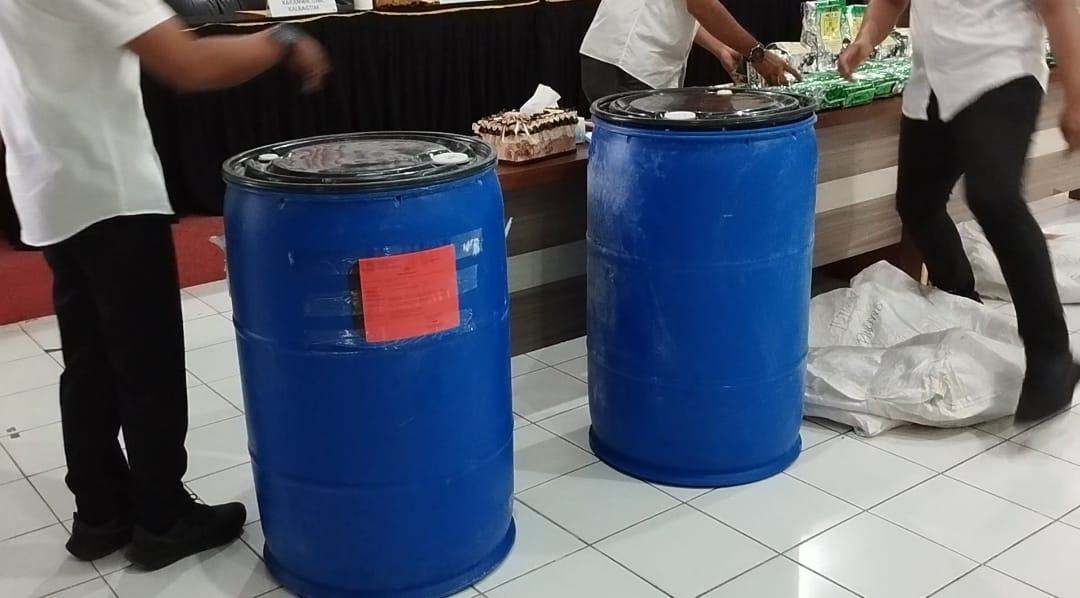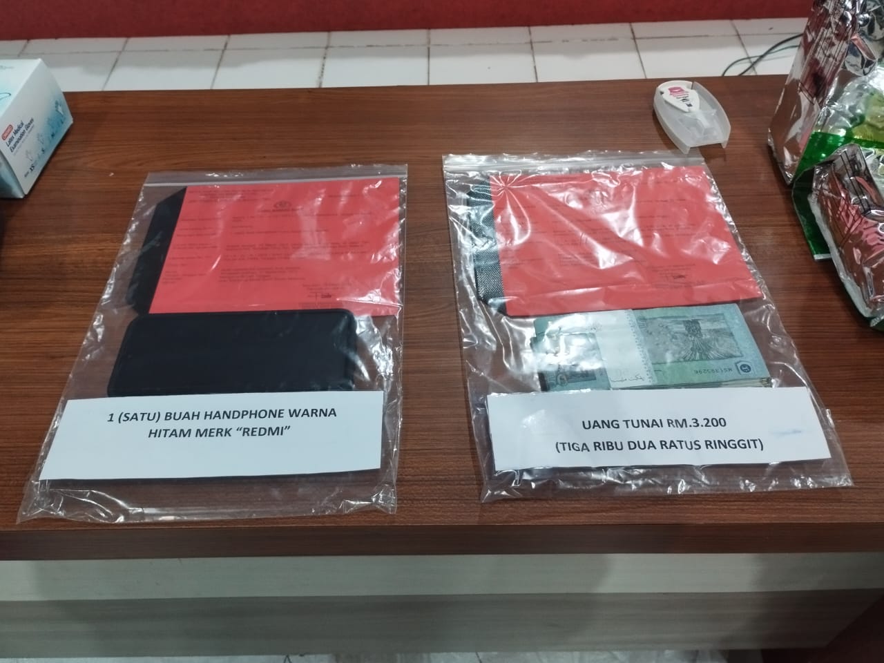 Barang bukti yang diamankan berupa 50 bungkus plastik sabu berukuran besar, 2 buah drum plastik warna biru, 2 (dua) buah plastik ukuran besar warna putih, uang tunai sebesar RM. 3.200 dan 1 buah unit Handphone warna hitam.