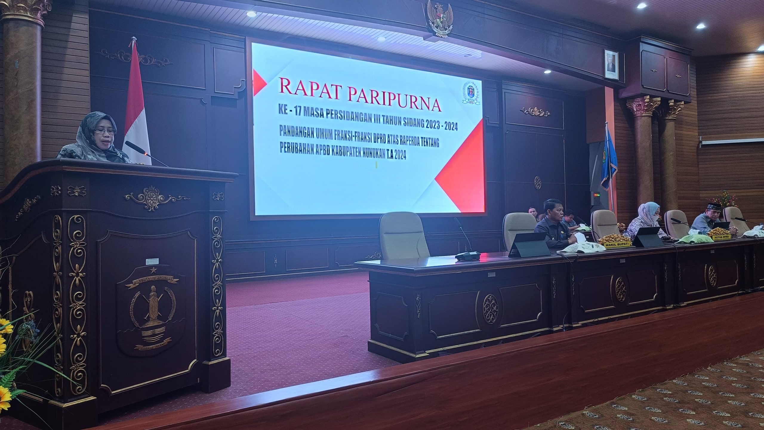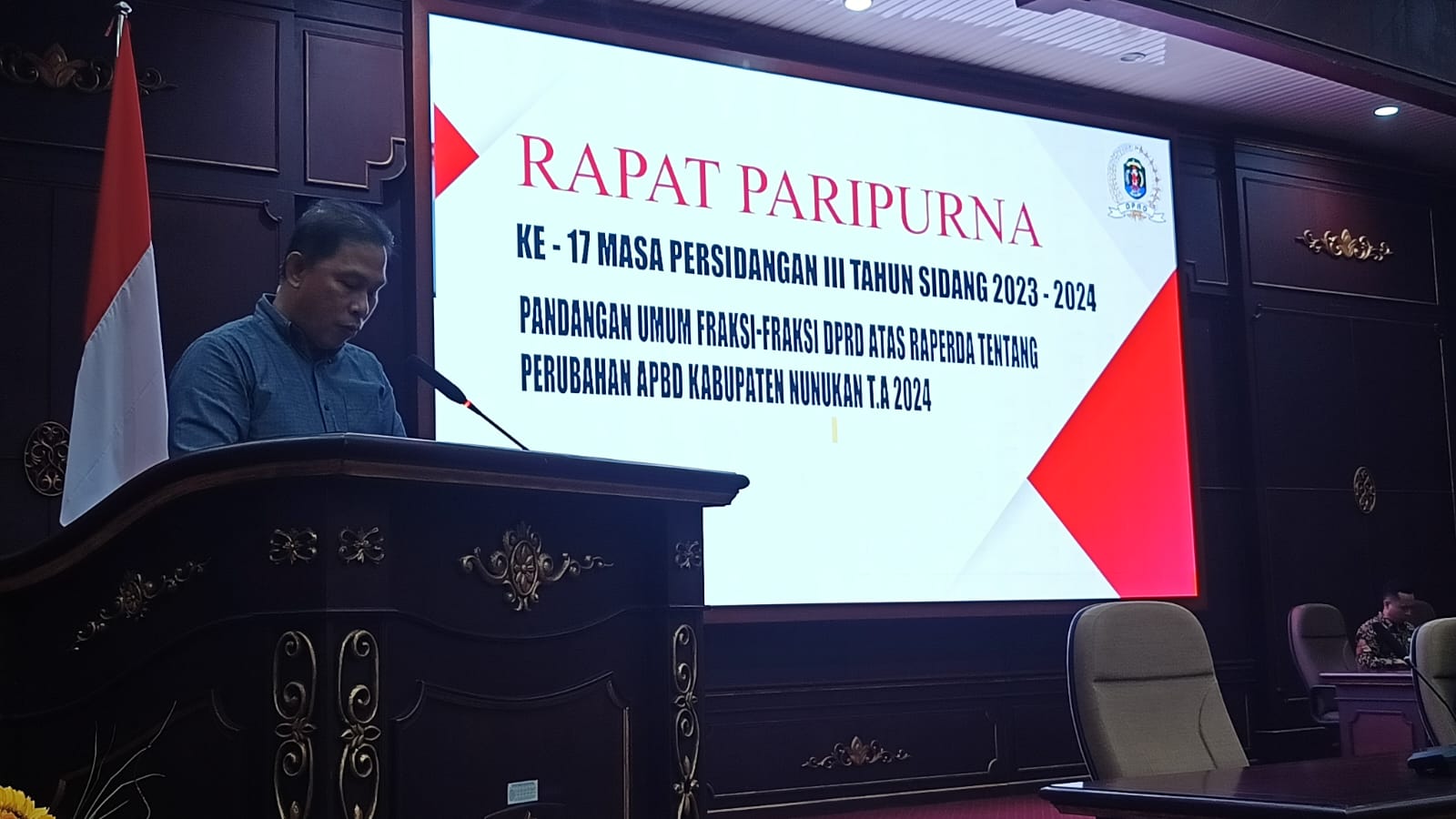 NUNUKAN – Fraksi-fraksi Dewan Perwakilan Rakyat Daerah (DPRD) Kabupaten Nunukan menyampaikan pandangan umum terkait rancangan peraturan daerah (Raperda) tentang perubahan anggaran pendapatan dan belanja daerah (APBD) Kab. Nunukan tahun 2024 pada rapat paripurna ke-17 masa persidangan III tahun sidang 2023-2024, bertempat di ruang paripurna kantor DPRD Nunukan, Jumat (02/08/2024).