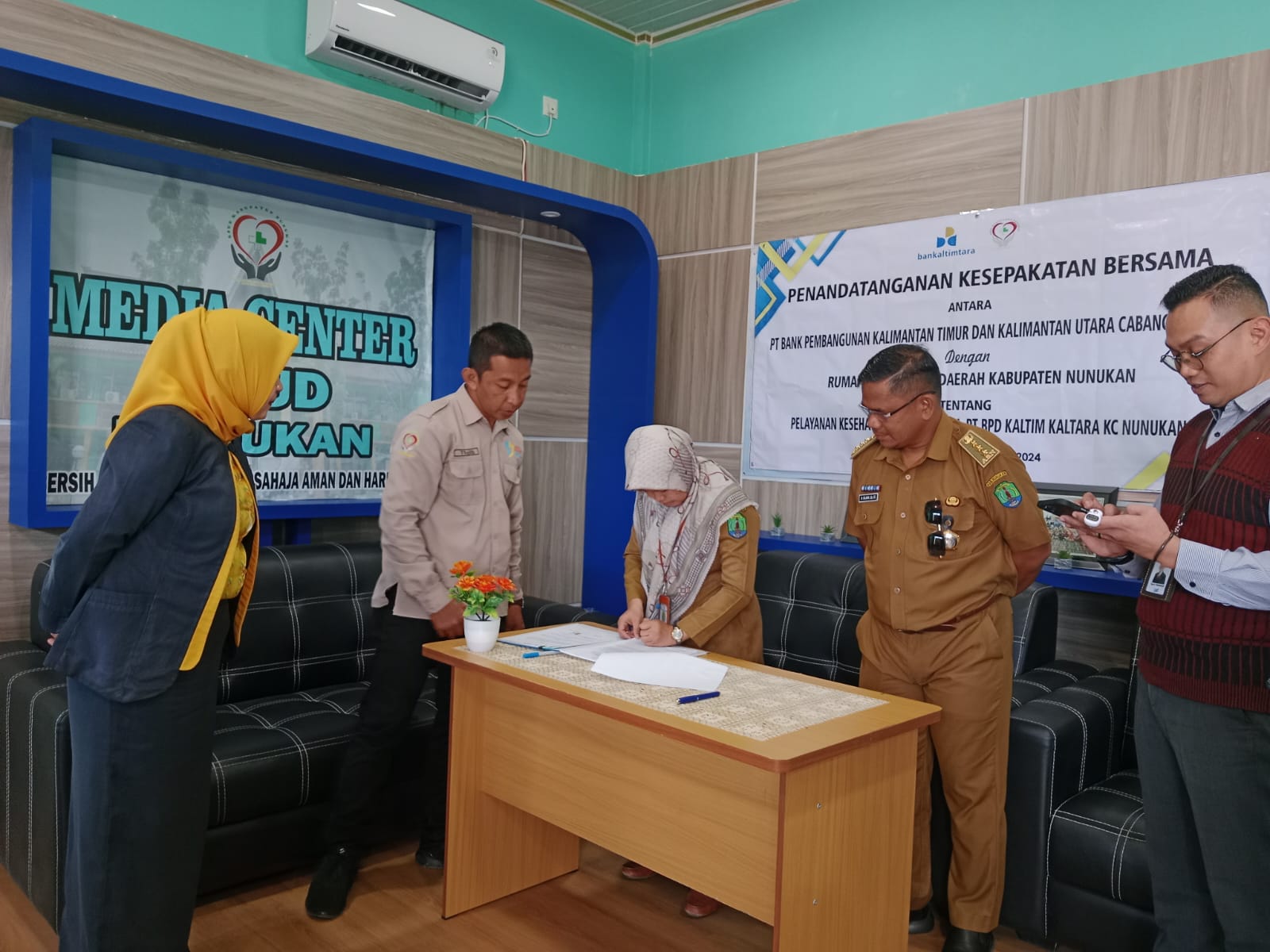 NUNUKAN – PT. Bank Pembangunan Daerah (BPD) Kalimantan Timur dan Kalimantan Utara atau Bank Kaltimtara Cabang Nunukan melakukan penandatanganan MoU bersama Rumah Sakit Umum Daerah (RSUD) Kabupaten Nunukan terkait pelayanan kesehatan pegawai BPD Kaltim Kaltara Kantor Cabang (KC) Nunukan di ruang Media Center RSUD Nunukan, Selasa (30/01/2024) pagi.