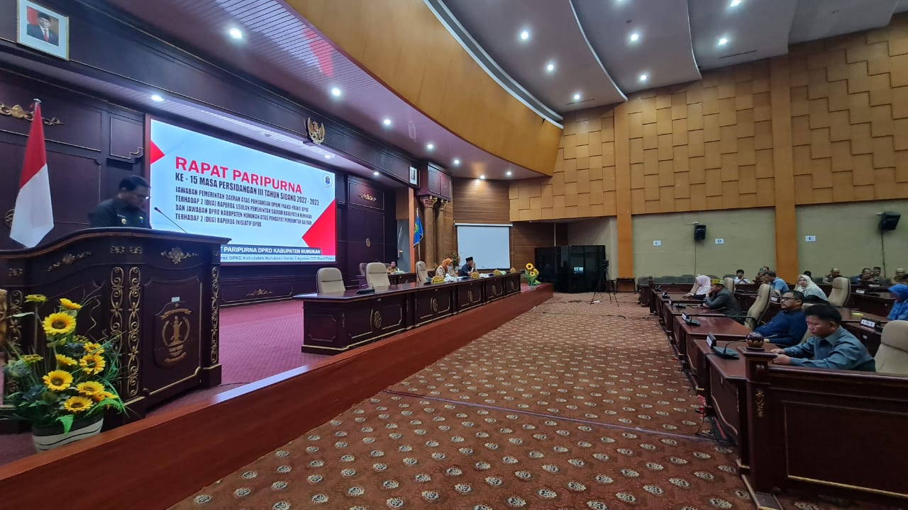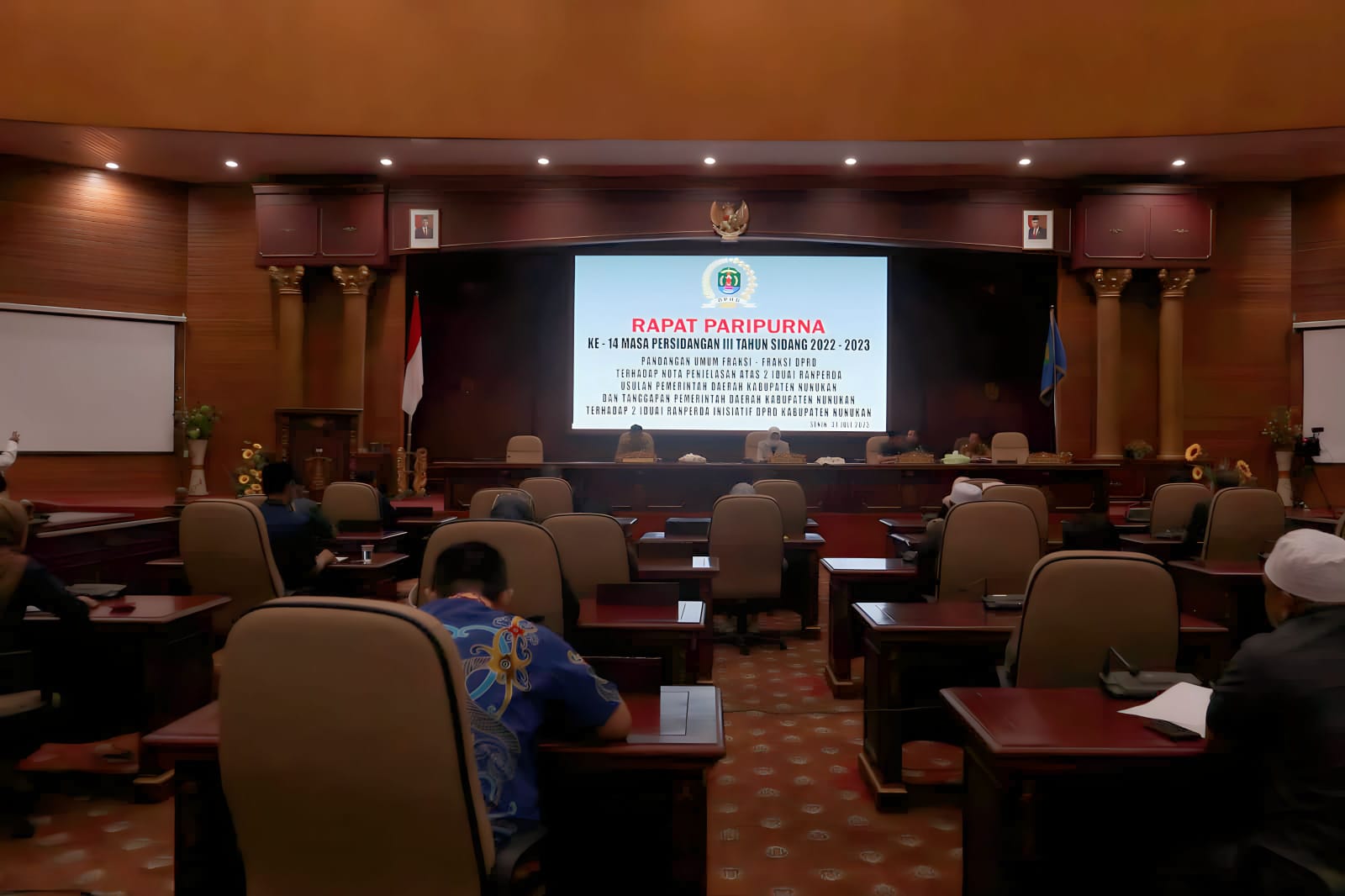 NUNUKAN – Bertempat di ruang sidang utama, Dewan Perwakilan Rakyat Daerah (DPRD) Kabupaten Nunukan gelar rapat paripurna ke-15 masa persidangan III tahun sidang 2022-2023 tentang jawaban Pemerintah Daerah (Pemda) atas pandangan umum fraksi-fraksi DPRD terhadap 2 (dua) rancangan peraturan daerah (Raperda) usulan Pemda, Senin (07/08/2023).
