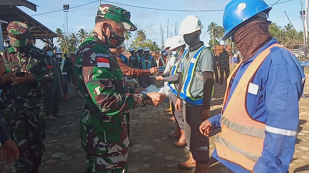 Dalam Memyampaikan aturan pemberlakuan pembatasan kegiatan masyarakat ( PPKM ) yang di tetapkan oleh pemerintah dari tanggal 26 Januari s/d 8 Pebruari 2021 dengan memberikan pemahaman kepada para pekerja Proyek PLBN tentang protokol kesehatan covid-19 yaitu dengan cara menjalankan 5 M yang benar.