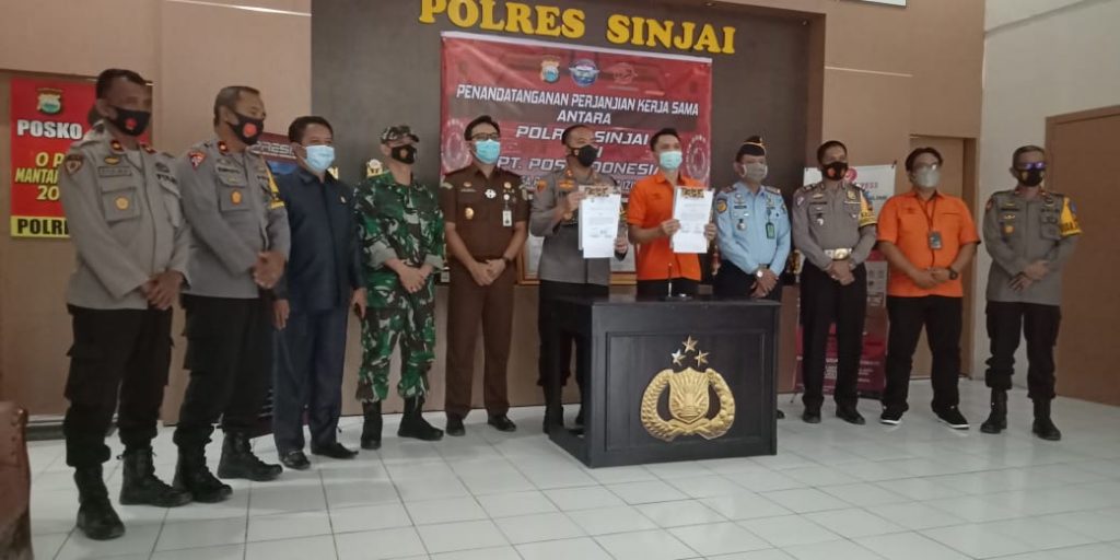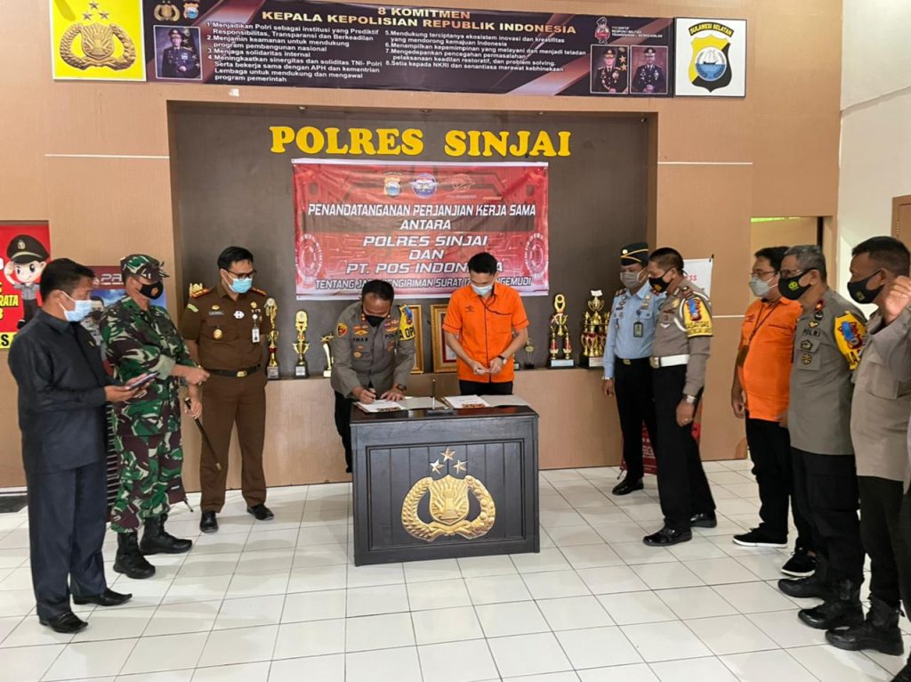 Sinjai-Berandankrinews.com Polres Sinjai dengan PT. Pos Sinjai melaksanakan Acara penandatangan Memorandum of Understanding (MoU) yang dihadiri unsur forkopimda Pejabat Utama Polres Sinjai, yang bertempat dilobby Pratasara Wirya Mapolres Sinjai, Selasa (13/04/2021).