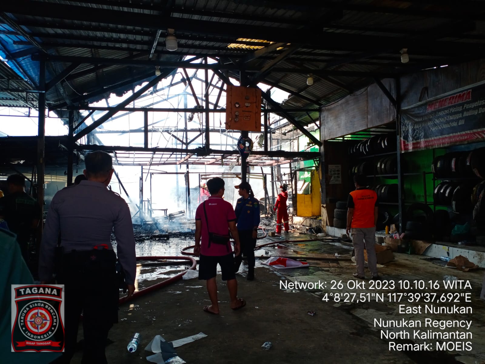 Kebakaran terjadi sekitar pukul 09.30 Wita. Diduga Api berasal dari Atap Plafon Bengkel, kemudian menjalar ke area sekitar.