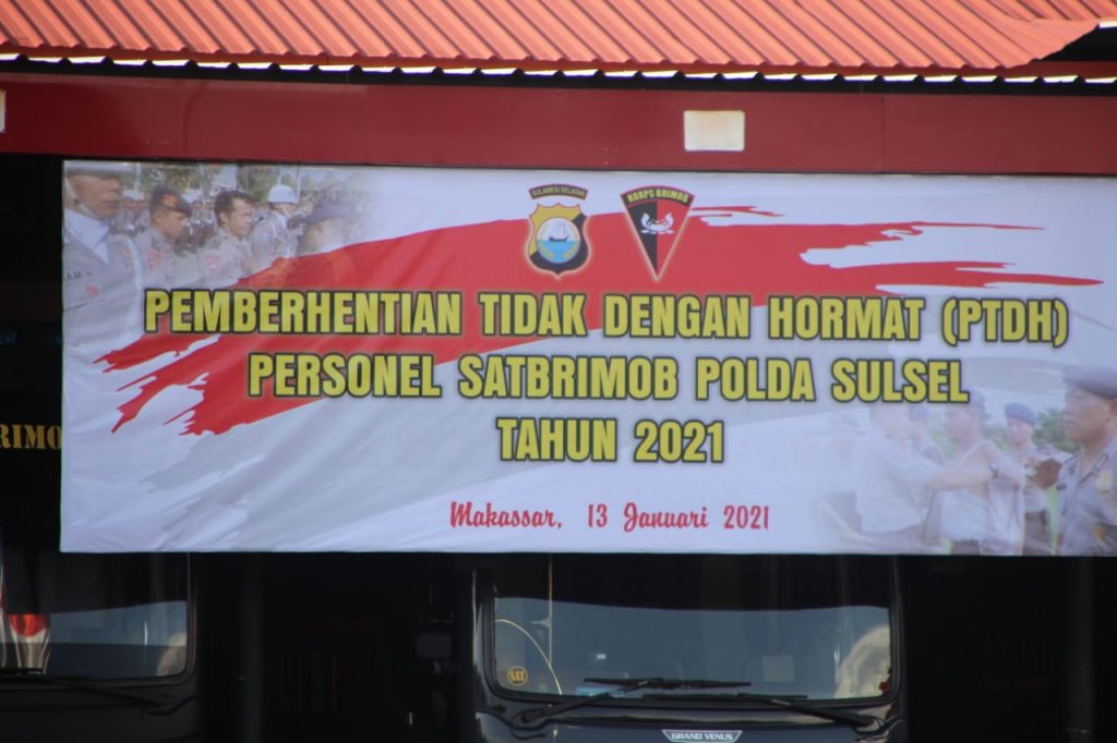 Pada Rabu (13/01/21) bertempat di Mako Satbrimob Polda Sulsel jalan K.S. Tubun Kota Makassar, Komandan Satuan ( Dansat ) Brimob Polda Sulsel Kombes Pol. Muhammad Anis, P.S.,S.I.K.,M.Si. memimpin langsung jalannya upacara PTDH ( Pemberhentian Tidak Dengan Hormat) 4 personel Satbrimob Polda Sulsel yang melakukan pelanggaran berat dan tindak pidana.