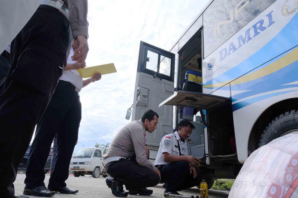 Dalam kesempatan itu, pemeriksaan kendaraan dilakukan pada 7 unit armada angkutan umum bus Damri dan telah dinyatakan lulus uji dan layak jalan.