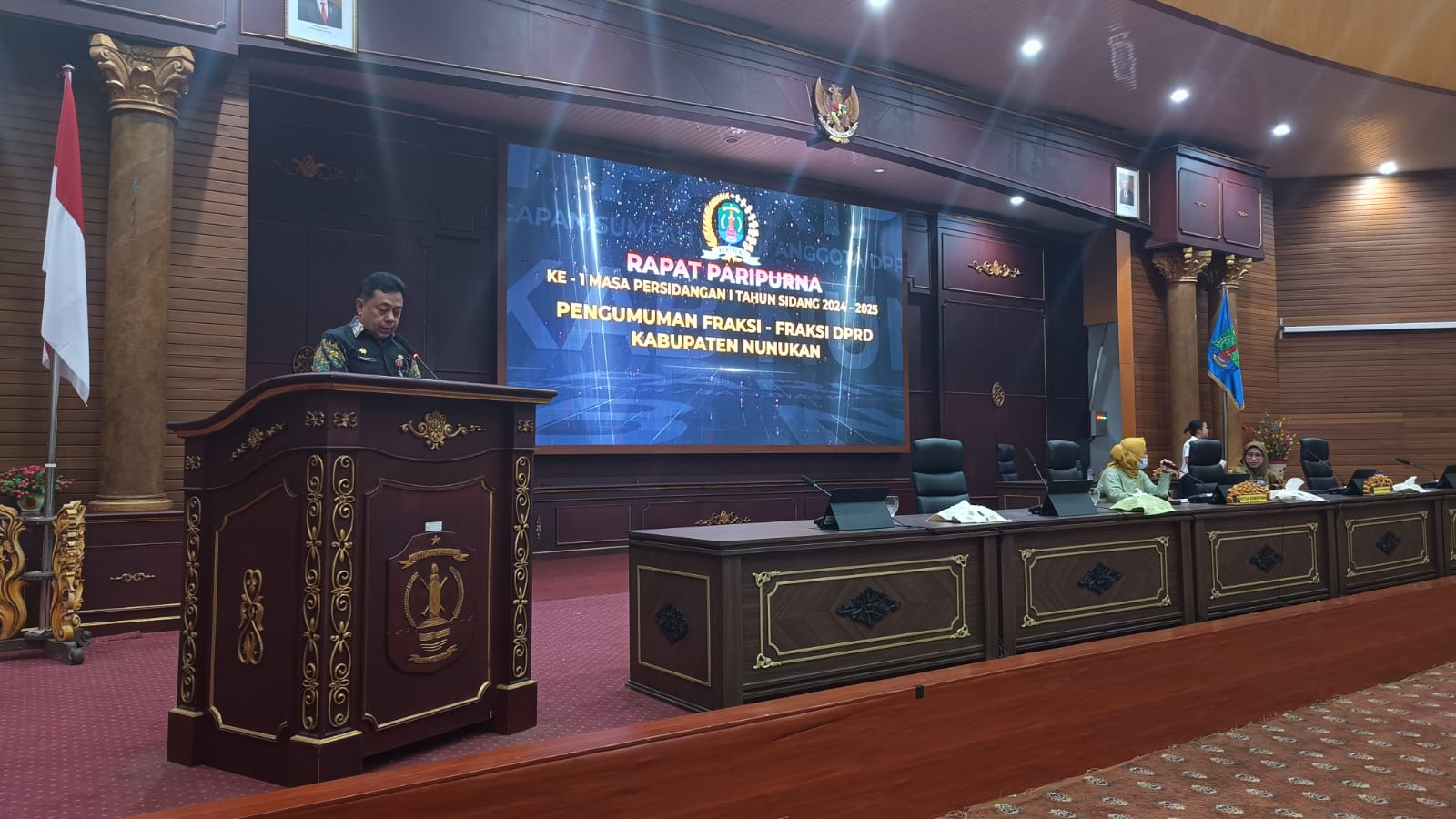 NUNUKAN – Dewan Perwakilan Rakyat Daerah (DPRD) Kabupaten Nunukan menggelar sidang paripurna terkait pengunguman pembentukan fraksi pada rapat paripurna ke-1 masa persidangan I tahun sidang 2024 – 2025 di ruang paripurna kantor DPRD Nunukan, Rabu (28/08/2024) siang.