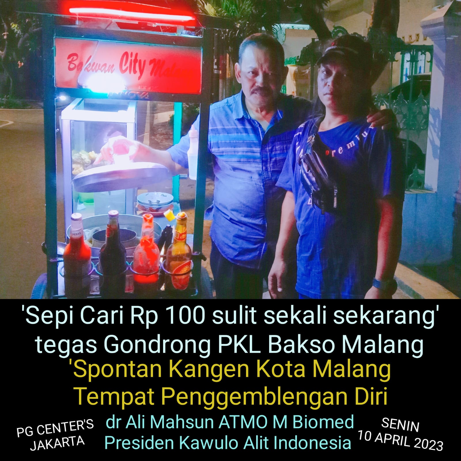 Jakarta-Berandankrinews.com. Ditengah makin panasnya dinamika tata kehidupan di negeri ini, sungguh memiluhkan apa yang disampaikan Cak Gondrong Penjual Bakso City Malang Asli Magelang Jawa Tengah untuk mencari Rp 100 ribu saat sulit sekali. Itulah keluh kesah Kawulo Alit Cak Gondrong kepada Presiden Kawulo Alit Indonesia (KAI) dr Ali Mahsun ATMO M Biomed di PG CENTER’S JAKARTA Senin Malam 10 April 2023.