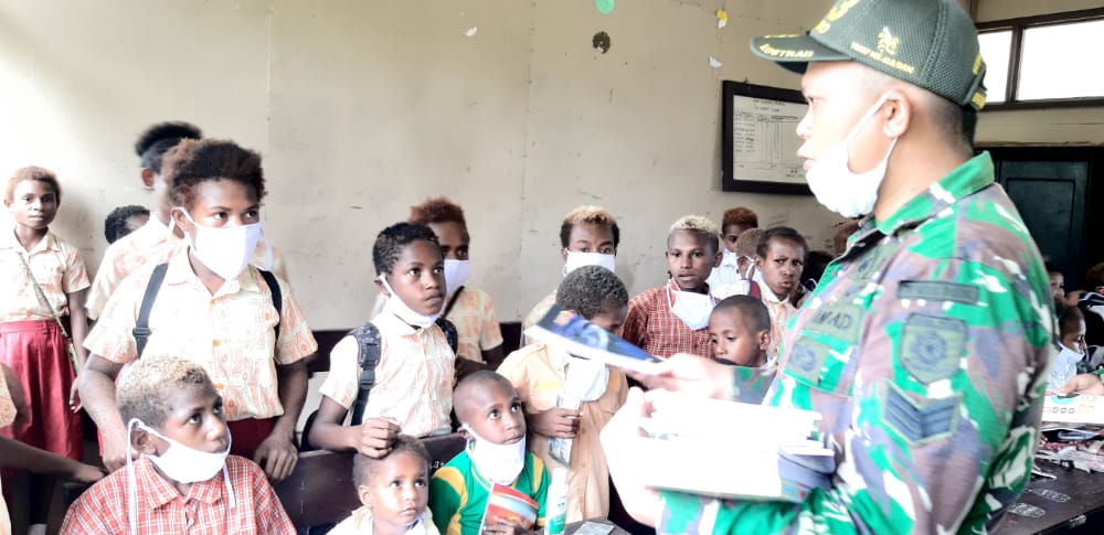 Jayapura-Berandankrinews.com Dalam mendukung proses kegiatan belajar mengajar, Satgas Pamtas RI-PNG Yonif Mekanis Raider 413 Kostrad Pos Kaliasin membagikan buku tulis kepada siswa-siswa SD Kibay Kampung Kibay Distrik Arso Timur Kabupaten Keerom.