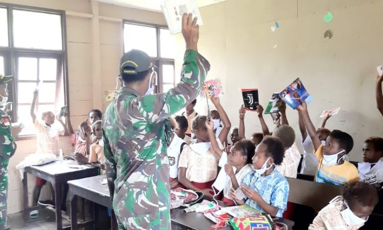Jayapura-Berandankrinews.com Dalam mendukung proses kegiatan belajar mengajar, Satgas Pamtas RI-PNG Yonif Mekanis Raider 413 Kostrad Pos Kaliasin membagikan buku tulis kepada siswa-siswa SD Kibay Kampung Kibay Distrik Arso Timur Kabupaten Keerom.