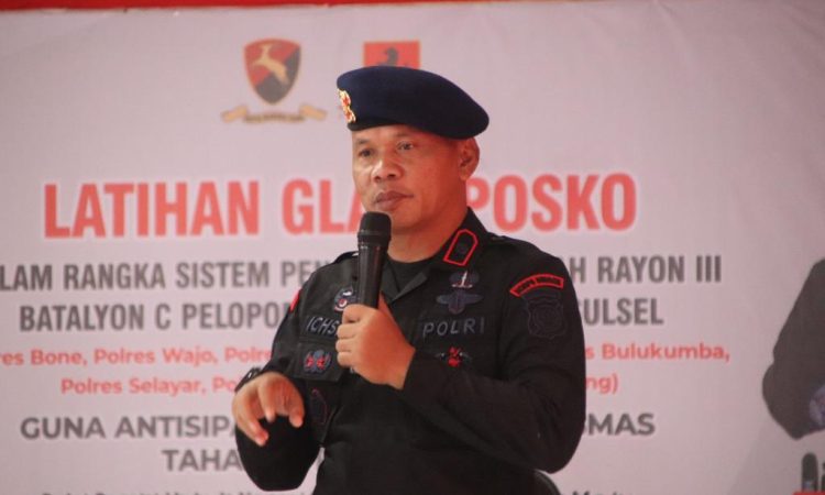 Bertempat di aula serba guna Mako Brimob Bone, gladi posko yang dilaksanakan guna mengantisipasi gangguan Kamtibmas tahapan Pemilu 2024 ini diikuti 6 (enam) Polres Wilayah Rayon III yaitu Polres Soppeng, Wajo, Bone, Sinjai, Bulukumba dan Selayar dan dua Polres Wilayah Rayon I yakni Polres Bantaeng dan Jeneponto.