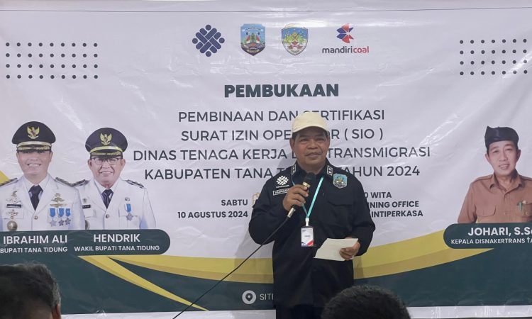 TIDUNG PALE – Kepala Dinas Ketenagakerjaan dan Transmigrasi (Disnakertrans) Kaltara, H. Haerumuddin, SH, M.AP., membuka secara resmi kegiatan pembukaan Pembinaan dan Sertifikasi Surat Izin Operator (SIO) bersama Dinas Tenaga Kerja dan Transmigrasi Kabupaten Tana Tidung, bertempat di ruang training office PT. Mandiri Inti Perkasa, Sabtu (10/8).