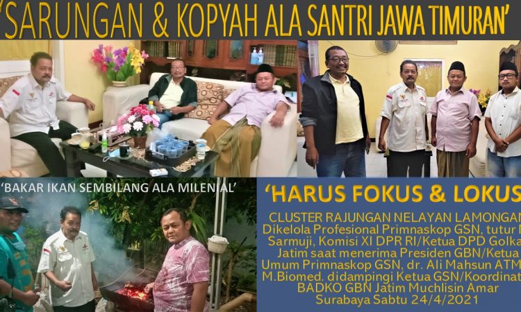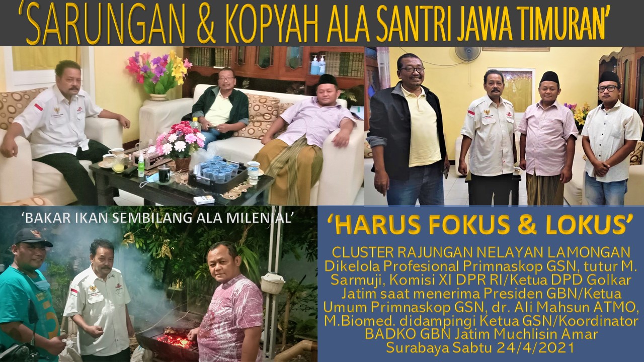 Saya yakin Primnaskop GSN Jawa Timur dibawah kepemimpinan Pak Muchlisin Amar mampu mewujudkannya”, tutur M. Sarmuji, Tokoh Muda Bangsa Anggota Komisi XI DPR RI yang juga Ketua DPD Golkar Provinsi Jawa Timur yang memakai Sarung dan Kopyah Ala Santri Jawa Timuran kepada Presiden GBN, Ketua Umum Primnaskop GSN, dr. Ali Mahsun ATMO, M. Biomed. didampingi Ketua Primnaskop GSN/Koordinator Badko GBN Jatim, H. Muchlisin Amar dikediamannya di Surabaya, Sabtu Malam, 24 April 2021.