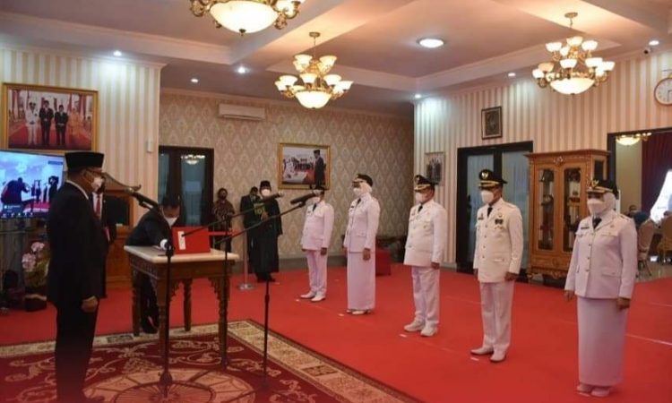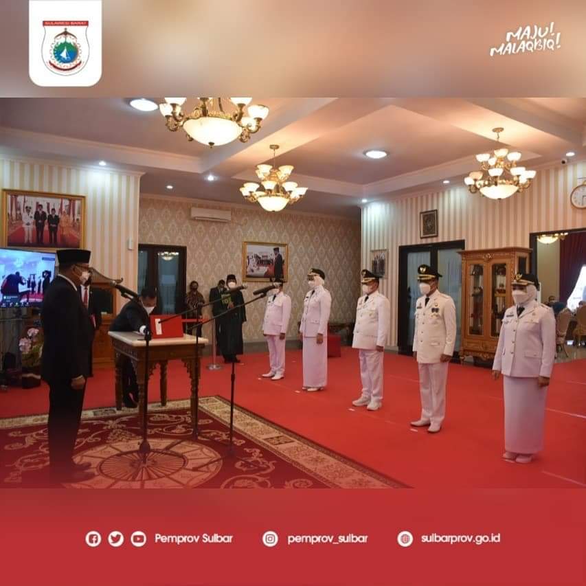 BerandaNKRINEWS.COM,-para pimpinan daerah yang dilantik yakni bupati dan wakil bupati Mamuju, Mamuju Tengah, dan Pasangkayu hasil pemilihan serentak tahun 2020 di Rujab Gubernur Sulbar, Jumat, 26 Februari 2021.