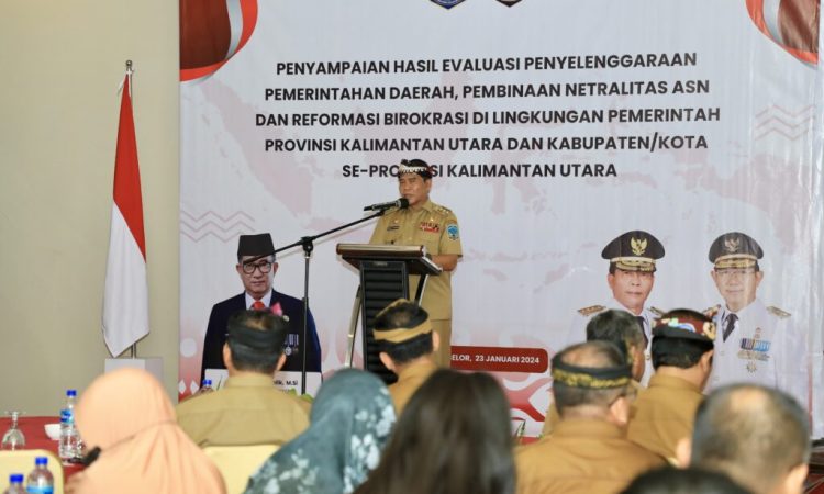 TANJUNG SELOR – Gubernur Kalimantan Utara (Kaltara), Drs. H. Zainal Arifin Paliwang, SH., MHum, memaparkan prestasi gemilang dalam evaluasi penyelenggaraan pemerintah daerah, pembinaan netralitas ASN, dan reformasi birokrasi di lingkungan Pemerintah Provinsi Kaltara di Ballroom Hotel Luminor, Selasa, (23/1).
