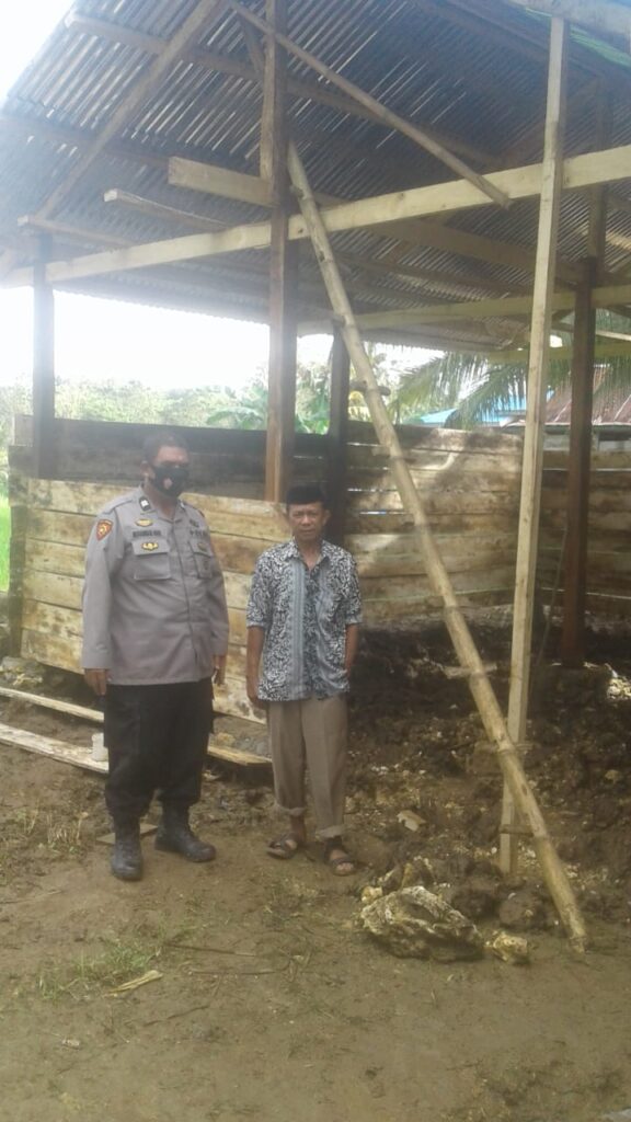 Terlihat Bhabinkamtibmas Aiptu Muh. Aras tengah bersama warga Dusun Lagero Desa Bengo saling berbaur memperbaiki kediaman keluarga Abd. Halim pasca mengalami kebakaran kemarin.