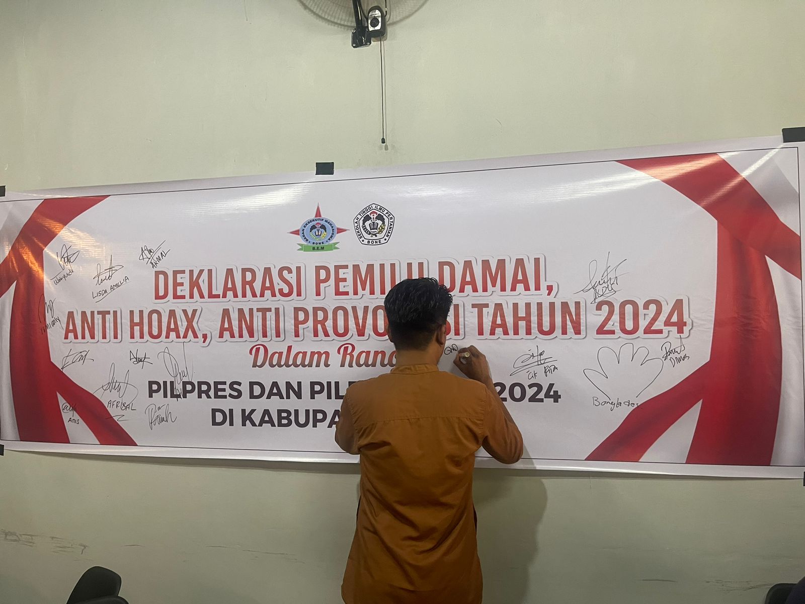 Penandatanganan spanduk deklarasi oleh Pengurus BEM STIP Yapi Bone sebagai bentuk pernyataan kesiapan bersama dalam menjaga situasi keamanan Kab. Bone yang kondusif saat masa tahapan pemilu 2024.