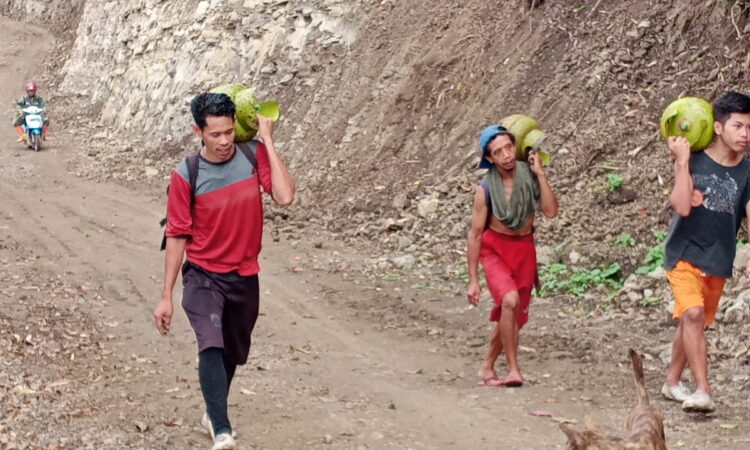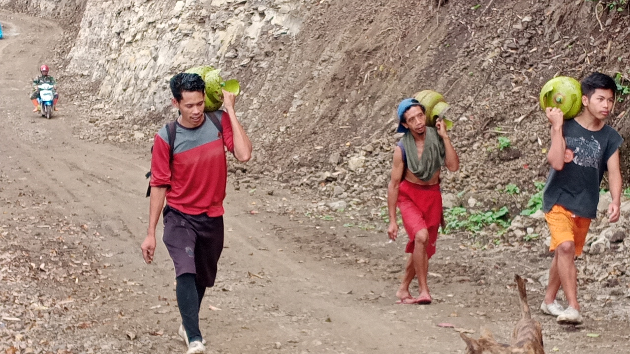 Warga memikul beras dan bahan-bahan lainnya, sambil berjalan kaki di jalan yang licin terguyur hujan ringan hingga ke kampung Tola.