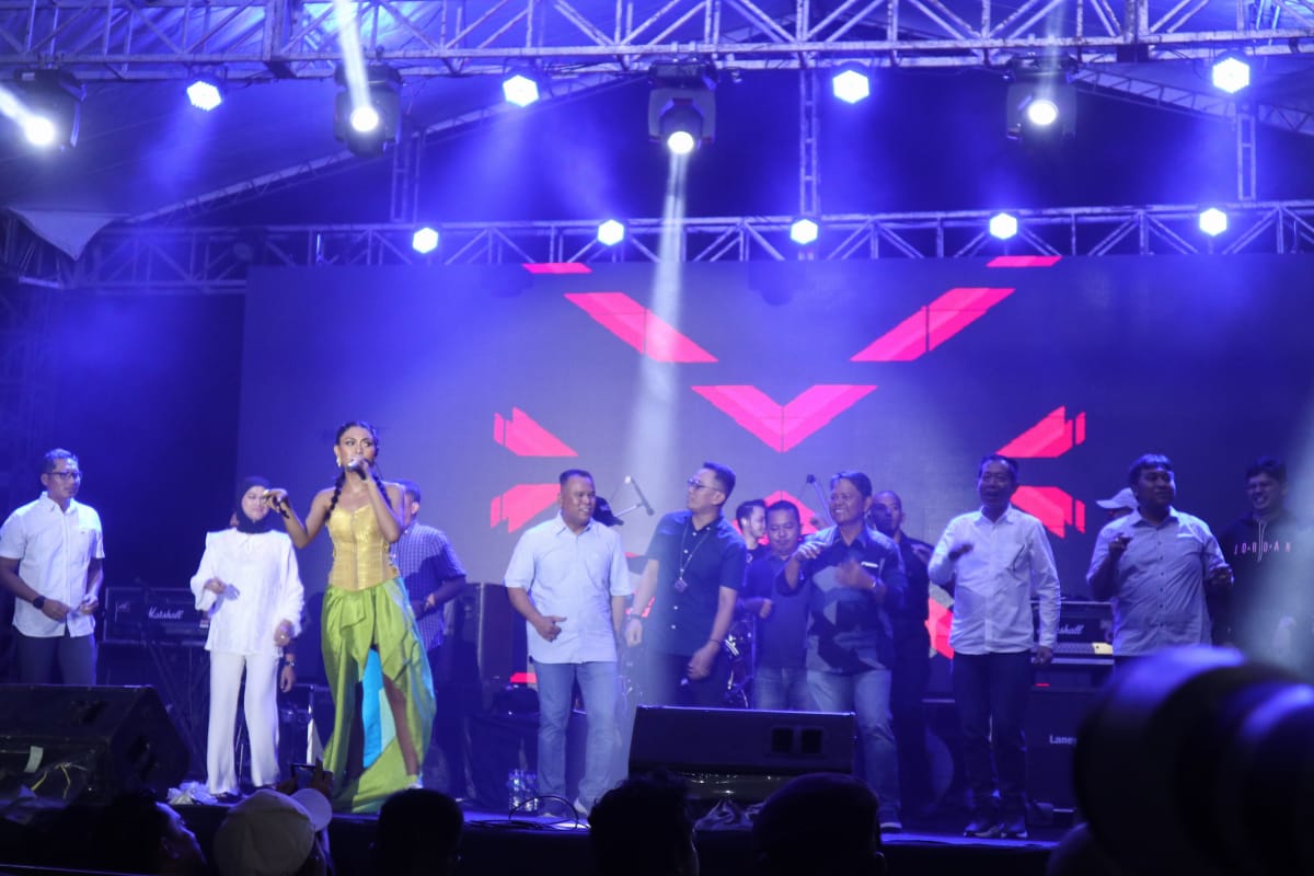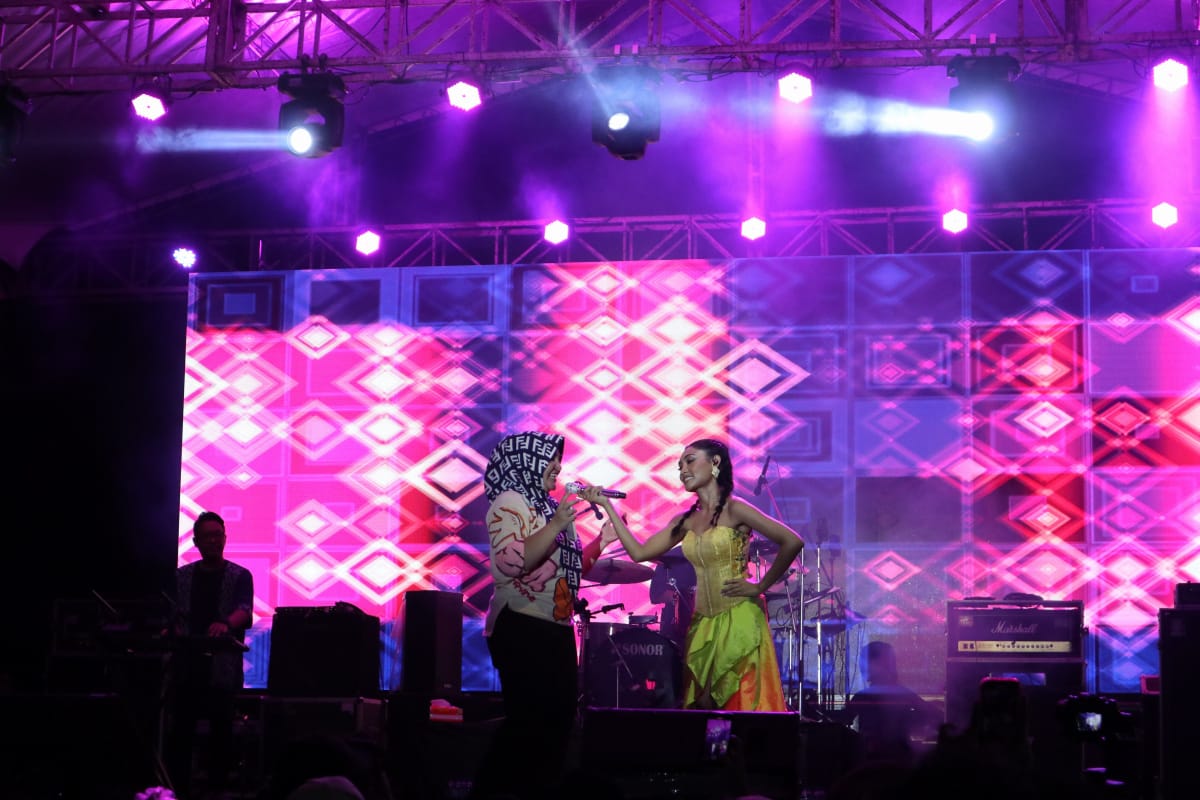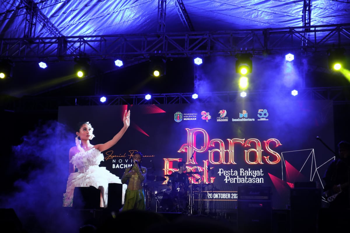 NUNUKAN – Penyanyi ternama Novia Bachmid menghibur masyarakat Nunukan menjelang penutupan rangkaian kegiatan Pesta Rakyat Perbatasan Festival di Pasar Rakyat Sejahtera (Paras) Perbatasan, Jumat (20/10/2023) malam.