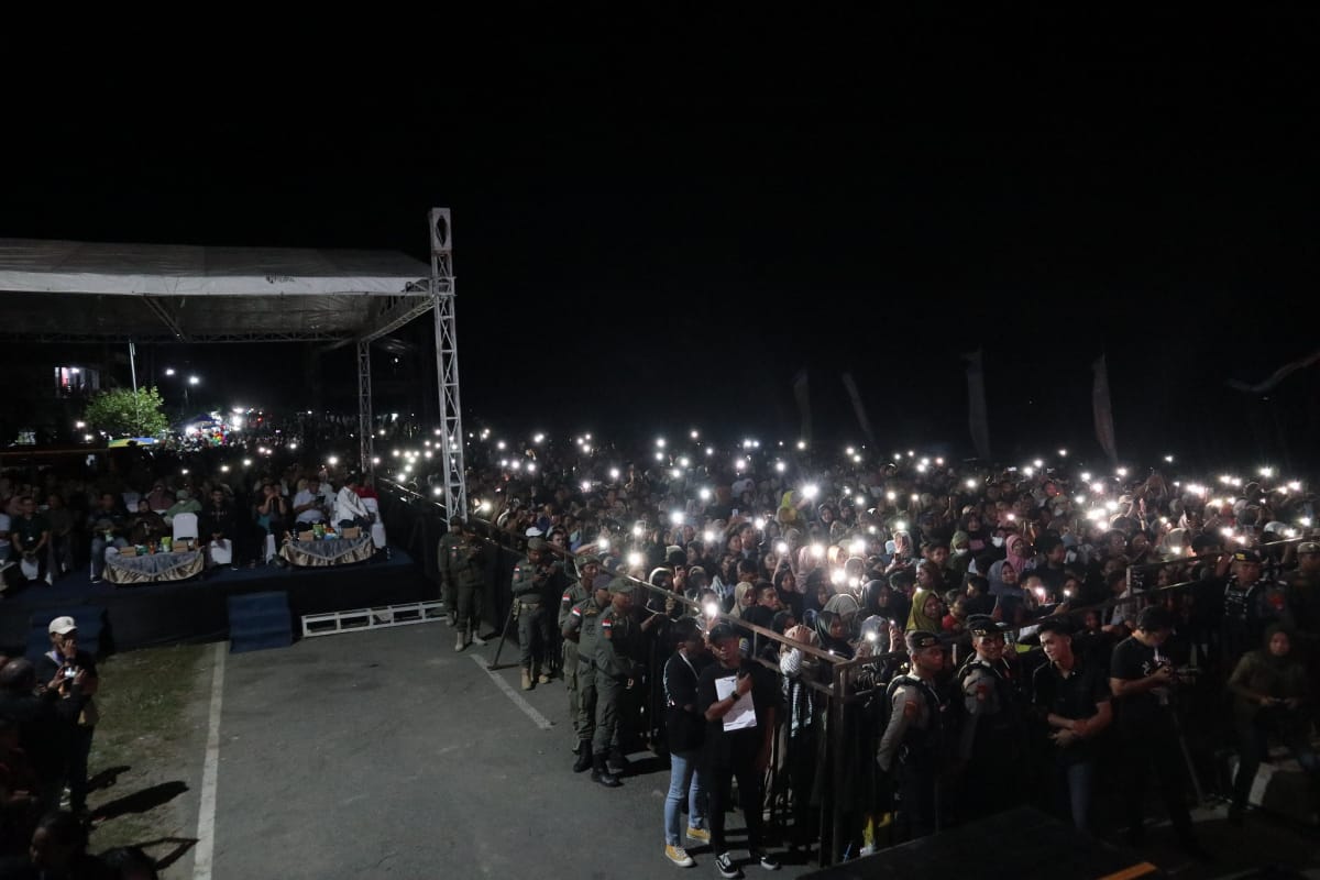 Terlihat masyarakat sangat antusias menyaksikan penampilan penyanyi jebolan Indonesian Idol 2020 itu dengan ikut bernyanyi serta memadati sekitaran panggung di Jl.Lingkar.