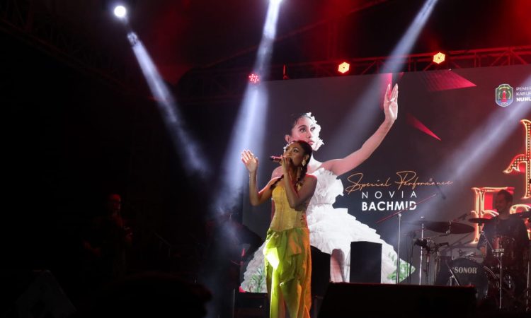 NUNUKAN – Penyanyi ternama Novia Bachmid menghibur masyarakat Nunukan menjelang penutupan rangkaian kegiatan Pesta Rakyat Perbatasan Festival di Pasar Rakyat Sejahtera (Paras) Perbatasan, Jumat (20/10/2023) malam.