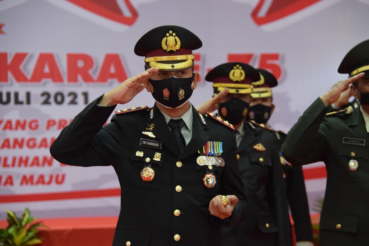 Bone-Berandankrinews.com. Hari Bhayangkara Ke-75 Polres Bone yang dilaksanakan secara virtual dengan Inspektur Upacara Presiden Republik Indonesia Joko Widodo di Istana Negara dan Kapolres Bone AKBP Try Handako Wijaya Putra,S.IK. bersama Bupati Bone Dr.H.Andi Fahsar M. Padjalangi, M.Si., dan Forkopimda Bone serta para undanga lainnya mengikuti upacara di Gedung Latea Riduni Rumah jabatan Bupati Bone. Kamis 01/07/2021